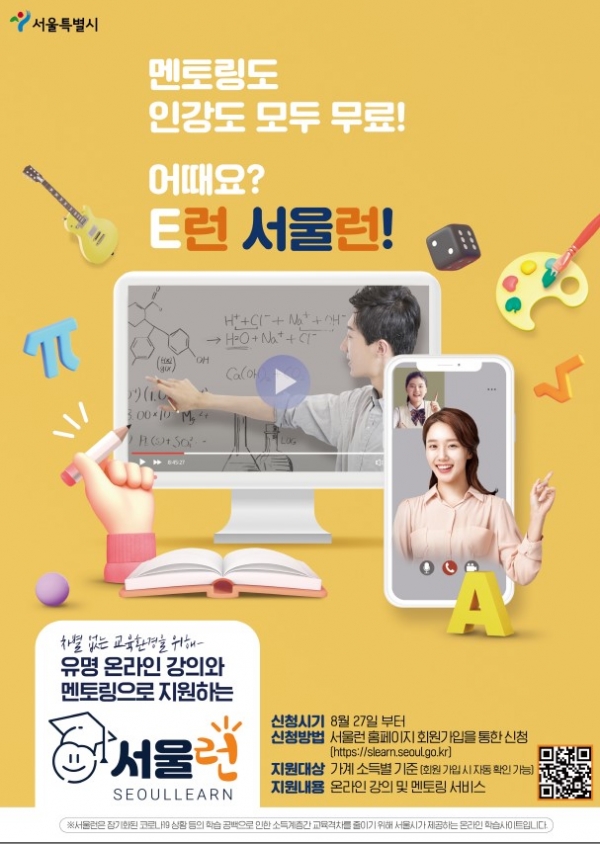 8¿ù 27ÀÏ(±Ý), Â÷º° ¾ø´Â ±³À°È¯°æÀ» À§ÇÑ ¼¿ï½Ã ¿Â¶óÀÎ ÇнÀ»çÀÌÆ® ¡®¼¿ï·±¡¯(https://slearn.seoul.go.kr)ÀÌ µåµð¾î ¿Àǵ˴ϴÙ. Áö¿ø ´ë»óÀÚ´Â ¿ì¼ö ¿Â¶óÀÎ °ÀÇ ¹× ¸àÅ丵 ¼ºñ½º¸¦ ¹«·á·Î ÀÌ¿ëÇÏ½Ç ¼ö ÀÖÀ¸¸ç, ´ë»ó ¿©ºÎ´Â ȸ¿ø°¡ÀÔ ½Ã ÀÚµ¿À¸·Î È®ÀÎÇÏ½Ç ¼ö ÀÖ½À´Ï´Ù. Áö±Ý ¹Ù·Î ¼¿ï·±¿¡ ¹æ¹®ÇØ º¸¼¼¿ä!