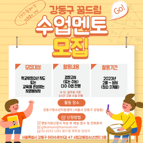 1. Ȱµ¿ °³¿ä ¡Û »ç ¾÷ ¸í : ´Ù¼ö(1:n) ¼ö¾÷¸àÅä ¸ðÁý ¡Û ¸ðÁý±â°ü : °µ¿±¸ û¼Ò³âÁö¿ø¼¾ÅÍ ²Þµå¸² ¡Û Ȱµ¿±â°£ : 2023³â 3¿ù ~ 12¿ù (ÃÖ¼Ò 3°³¿ù ÀÌ»ó) ¡Û Ȱµ¿³»¿ë : Çб³ ¹Û û¼Ò³â °ËÁ¤°í½Ã ÇнÀÁö¿ø, ÀԽôëºñ ÇнÀÁö¿ø µî ¡Û Ȱµ¿Àå¼Ò : °µ¿±¸ û¼Ò³âÁö¿ø¼¾ÅÍ ²Þµå¸² 2. ÇнÀ¸àÅä ¸ðÁý°³¿ä ¡Û ¸ðÁý´ë»ó : Çб³¹Ûû¼Ò³â Áöµµ ¶Ç´Â ±³À°¿¡ °ü½É ÀÖ´Â ÀÚ¿øºÀ»çÀÚ ¡Û ¸ðÁýÀοø : 00¸í ¡Û ¸ðÁý±â°£ : ¿¬Áß »ó½Ã ¡Û ½Åû¹æ¹ý : ¸àÅä Áö¿ø½Åû¼ ÀÛ¼º ¸ÞÀÏÁ¢¼ö ¹× Àüȹ®ÀÇ(gdkdream@hanmail.net) ¡Û ¹® ÀÇ : ²Þµå¸² ±³À°Áö¿ø ´ã´çÀÚ À¯¹ÎÁ¤ (02-6252-1391) 3. ¼±¹ß ¹× Ȱµ¿ÀýÂ÷ ¼·ù Á¢¼ö | ¡æ | ¿À¸®¿£Å×ÀÌ¼Ç | ¡æ | ¸àÅäȰµ¿ | ¼·ù Á¢¼ö ¹× ¼±¹ß | ¸àÅä Ȱµ¿ ¾È³» ¹× ±³À° | ¸àƼ ¸ÅĪ ÈÄ È°µ¿ ½ÃÀÛ |