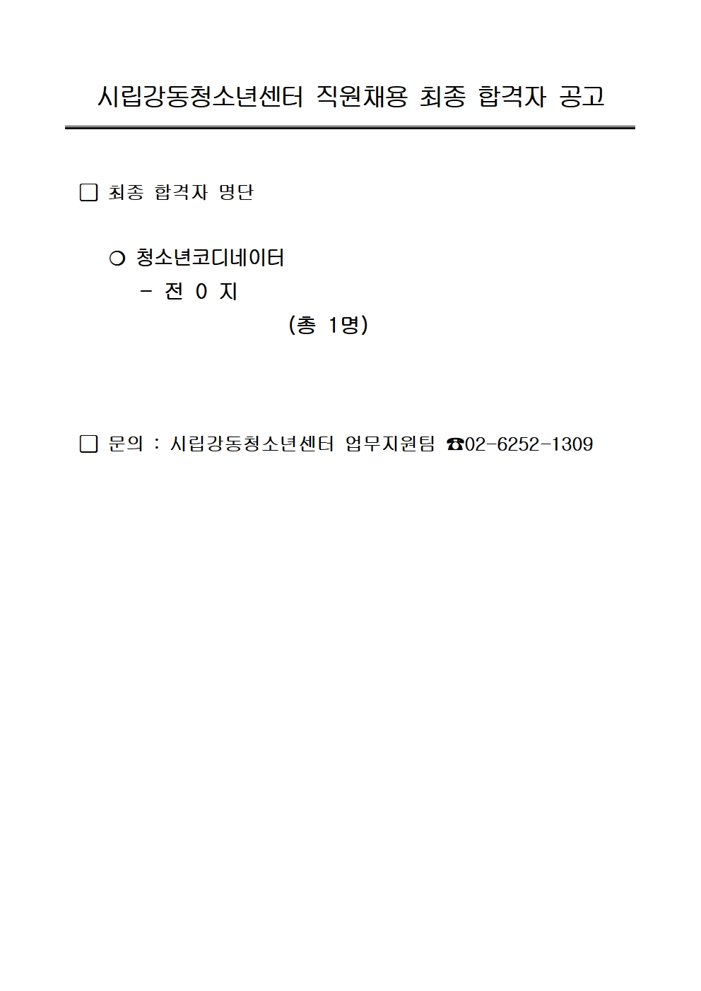 | ½Ã¸³°µ¿Ã»¼Ò³â¼¾ÅÍ Á÷¿ø(û¼Ò³âÄÚµð³×ÀÌÅÍ) ä¿ë °á°ú ¾È³» | |||
