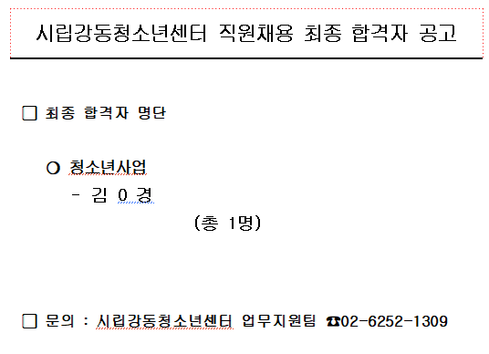 | ½Ã¸³°µ¿Ã»¼Ò³â¼¾ÅÍ Á÷¿ø(û¼Ò³â»ç¾÷) ä¿ë °á°ú ¾È³» | |||