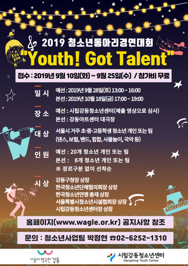 | 2019³â û¼Ò³âµ¿¾Æ¸®°æ¿¬´ëȸ "Youth! Got Talent" Âü°¡ ¸ðÁý ¾È³» | |||