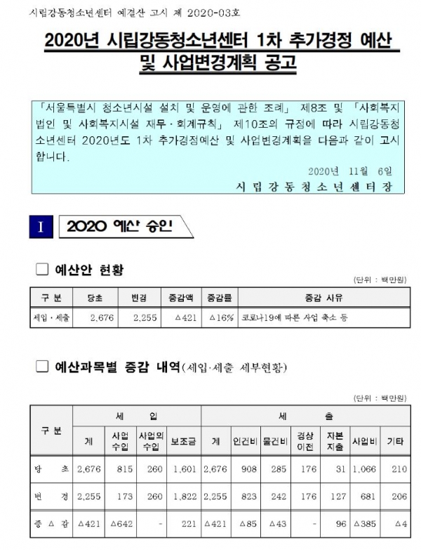 | [¿¹»ê°ø°í] 2020³â 1Â÷ Ã߰濹»ê ¹× »ç¾÷º¯°æ°èȹ ½ÂÀÎ ³»¿ª °ø°í | |||