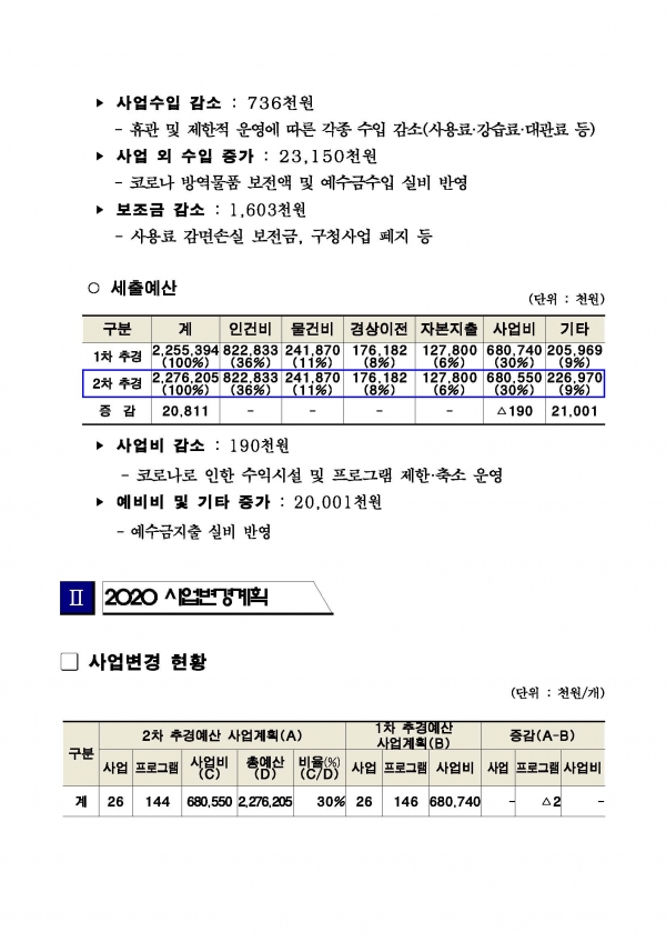 | [¿¹»ê°ø°í] 2020³â 2Â÷ Ã߰濹»ê ¹× »ç¾÷º¯°æ°èȹ ½ÂÀÎ ³»¿ª °ø°í | |||