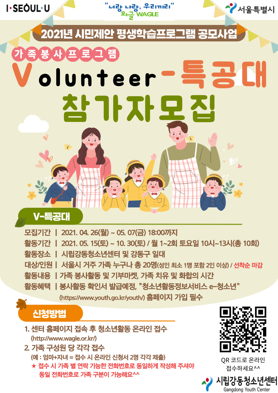 | 2021³â ¼¿ï½Ã ½Ã¹ÎÁ¦¾È Æò»ýÇнÀÇÁ·Î±×·¥ °ø¸ð»ç¾÷ "°¡Á·ºÀ»çÇÁ·Î±×·¥ V-Ư°ø´ë" Âü°¡ÀÚ ¸ðÁý(¸¶°¨) | |||