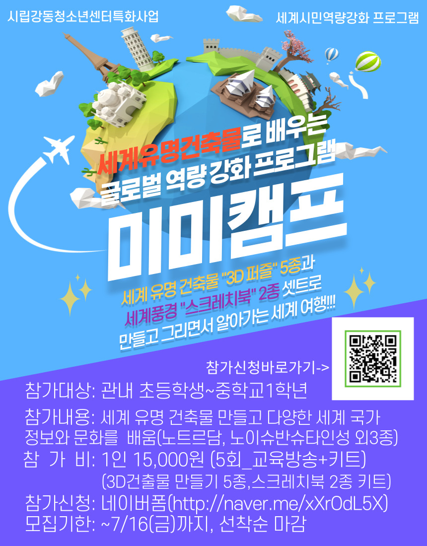 Âü°¡´ë»ó : ÀαÙÁö¿ª ¹× °µ¿±¸ °ÅÁÖ ¶Ç´Â ÀçÇÐ ÃʵîÇлý ~ ÁßÇб³ 1Çгâ Âü°¡³»¿ë : ¼¼°è À¯¸í °ÇÃ๰À» ¸¸µé°í ¹è¿ì´Â ±¹Á¦ Á¤º¸¿Í ¹®È ÀÌÇØ ±³À° (Àüü ºñ´ë¸é ÁøÇà) Âü°¡ºñ : 1ÀÎ 15,000¿ø (5ȸ_±³À°¹æ¼Û + ŰƮ:3D À¯¸í°ÇÃ๰ ÆÛÁñ 5Á¾, ¼¼°è dz°æ ½ºÅ©·¹Ä¡ºÏ 2Á¾) Âü°¡½Åû : ³×À̹öÆû http://naver.me/xXrOdL5X ¸ðÁý±âÇÑ : ~7/16(±Ý)±îÁö, ¼±Âø¼ø ¸¶°¨