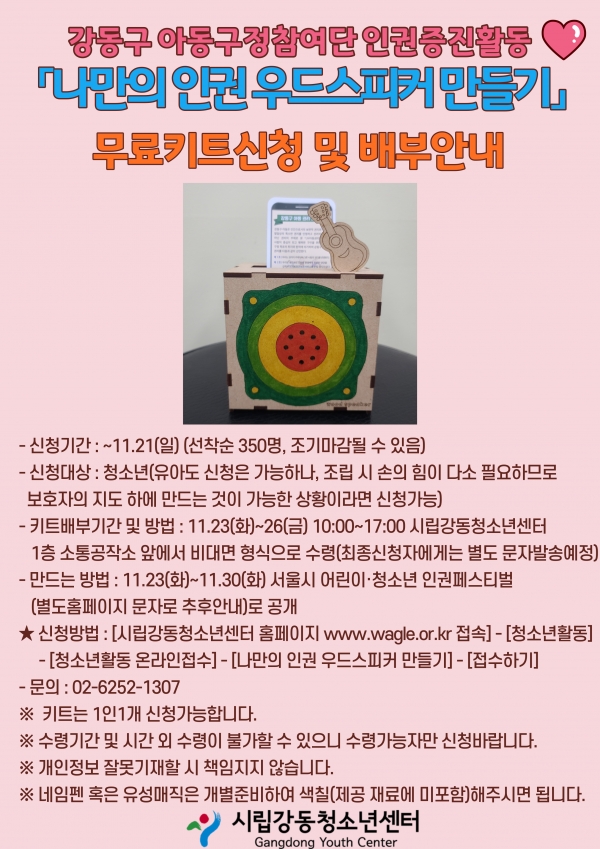 | ÀÛ¼ºÀÚ : ½Ã¸³°µ¿Ã»¼Ò³â¼¾ÅÍ(wagle1300@daum.net) ÀÛ¼ºÀÏ : 2021-11-15 Á¶È¸¼ö : 5409 | |||