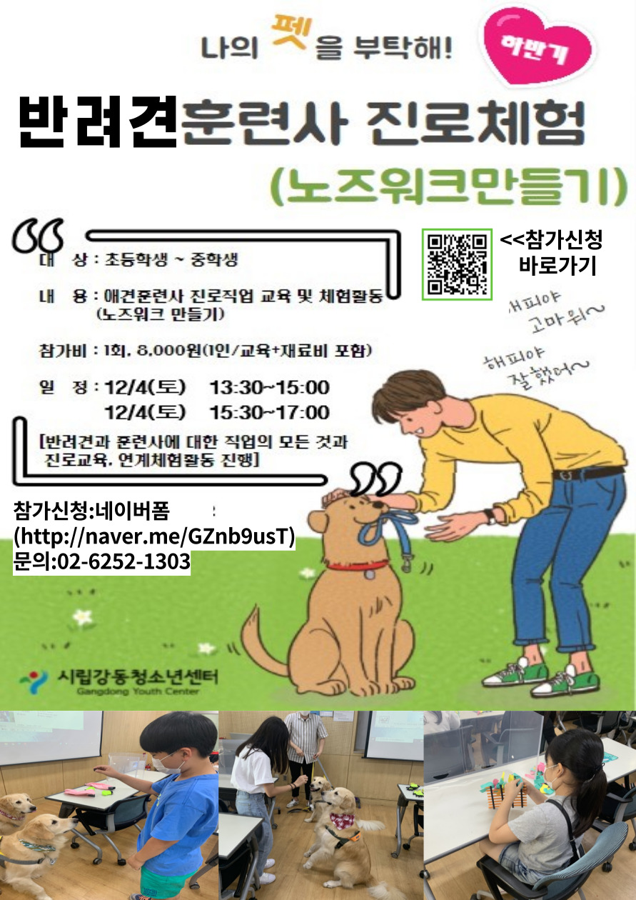-Âü°¡ÀÚ´ë»ó : ÃʵîÇлý~ÁßÇлý -Âü°¡ºñ : 1ÀÎ 1ȸ 8,000¿ø -³»¿ë : ÇöÁ÷ ¹Ý·Á°ßÈÆ·Ã»çÀÇ Áø·ÎƯ° ¹× ¹Ý·Á°ß ÈÆ·Ã ½Ç½À°ú ³ëÁî¿öÅ© ¸¸µé±â üÇè -¼±Âø¼ø ¸¶°¨ ¿¹Á¤(~12/2±îÁö ½Åû) -Àå¼Ò : ¼¾ÅÍ 2Ãþ ¼Ò±ØÀå(´ë¸é¿î¿µ) -Âü°¡ÀϽà : 12/4 Åä¿äÀÏ 13½Ã 30ºÐ ~ 15½Ã (90ºÐ) _ Ãë¼ÒÀÚ 2¸í Ãß°¡ ¸ðÁý 12/4 Åä¿äÀÏ 15½Ã 30ºÐ ~ 17½Ã (90ºÐ) _ ¸¶°¨