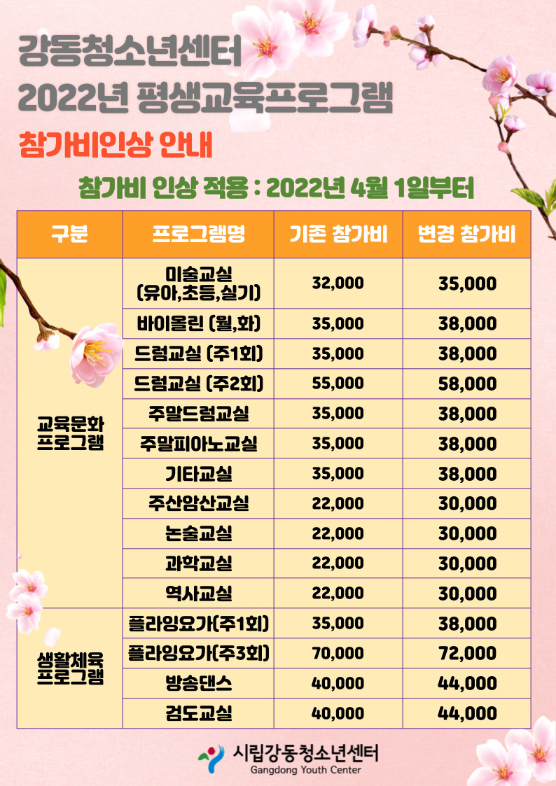 | 2022³â Æò»ý±³À°ÇÁ·Î±×·¥ Âü°¡ºñ Àλó ¾È³»(½ÇÇà 2022³â 4¿ù 1ÀÏ) | |||