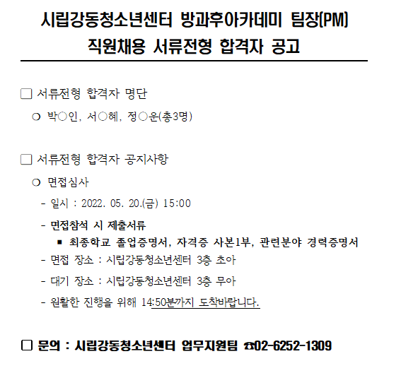 | ½Ã¸³°µ¿Ã»¼Ò³â¼¾ÅÍ Á÷¿ø(û¼Ò³â¹æ°úÈľÆÄ«µ¥¹Ì ÆÀÀå(PM))ä¿ë ¼·ùÀüÇü ÇÕ°ÝÀÚ °ø°í | |||
