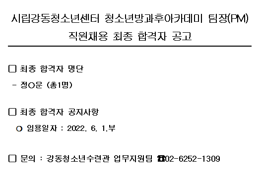 | ½Ã¸³°µ¿Ã»¼Ò³â¼¾ÅÍ Á÷¿ø(û¼Ò³â¹æ°úÈľÆÄ«µ¥¹Ì ÆÀÀå(PM))ä¿ë ÃÖÁ¾ ÇÕ°ÝÀÚ °ø°í | |||