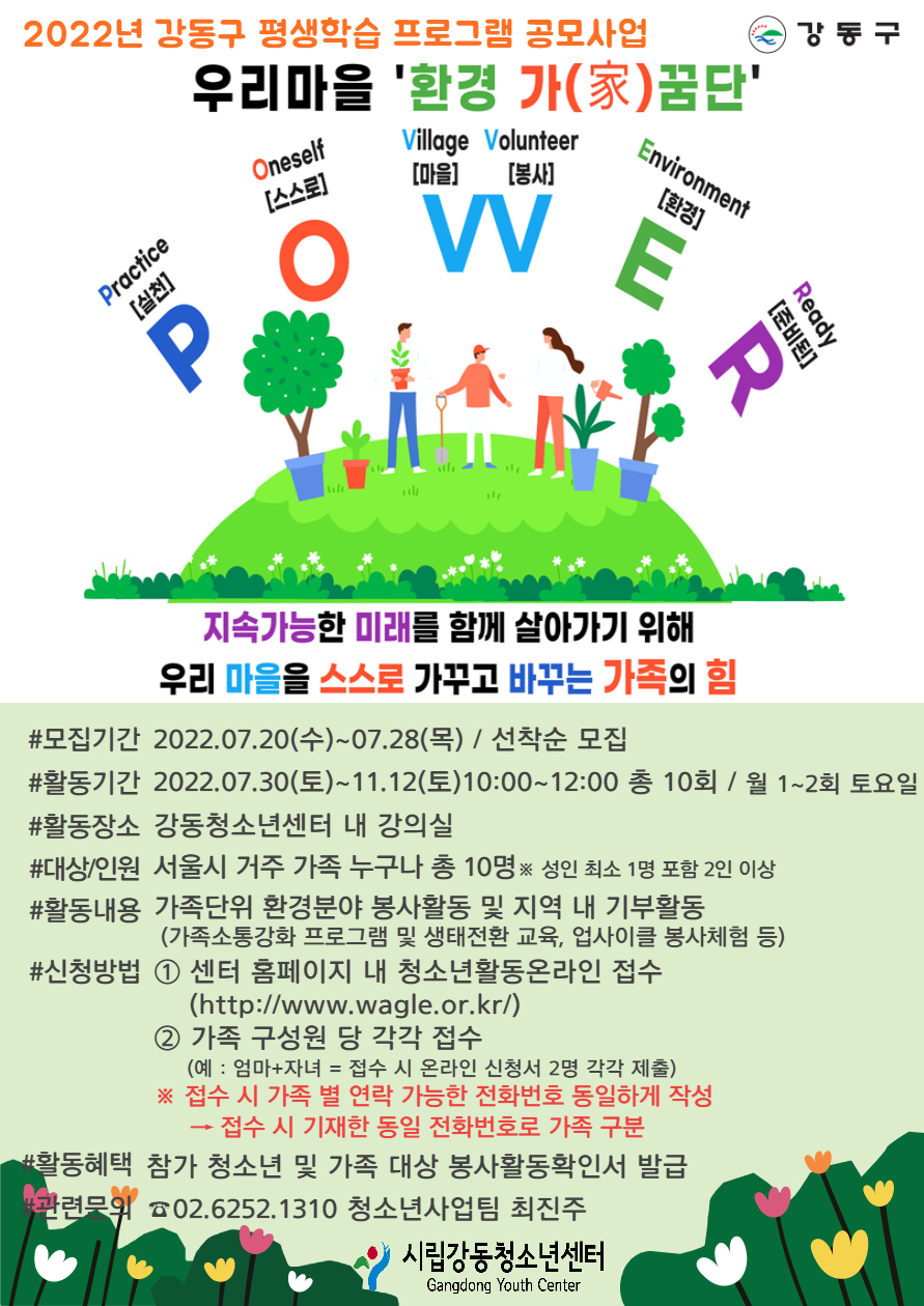 | [¸¶°¨ÀÓ¹Ú]2022³â °µ¿±¸ Æò»ýÇнÀÇÁ·Î±×·¥ °ø¸ð»ç¾÷ ¡®¿ì¸® ¸¶À» ȯ°æ °¡(Ê«)²Þ´Ü¡¯ Âü°¡ÀÚ ¸ðÁý | |||