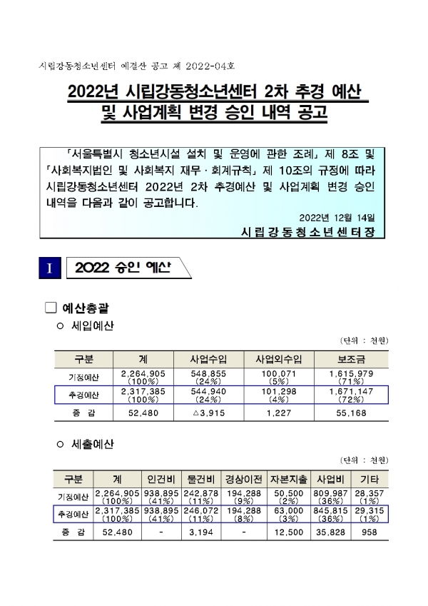 | [¿¹»ê°ø°í] 2022³â 2Â÷ Ãß°æ ¿¹»ê ¹× »ç¾÷°èȹ º¯°æ ½ÂÀÎ ³»¿ª °ø°í | |||