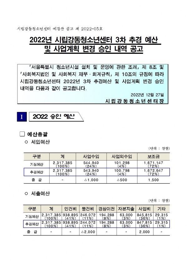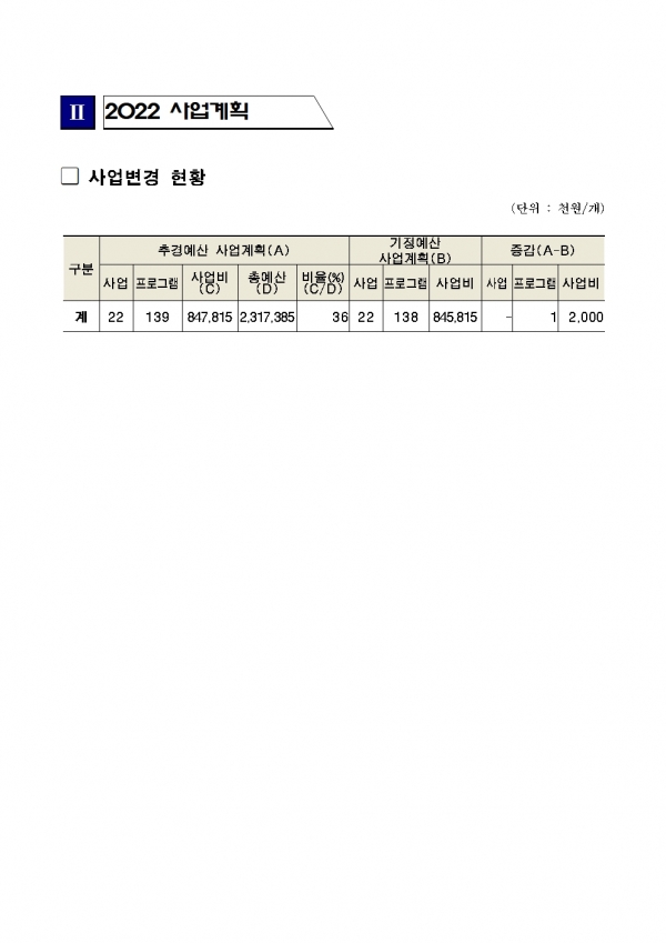 | [¿¹»ê°ø°í] 2022³â 3Â÷ Ãß°æ ¿¹»ê ¹× »ç¾÷°èȹ º¯°æ ½ÂÀÎ ³»¿ª °ø°í | |||