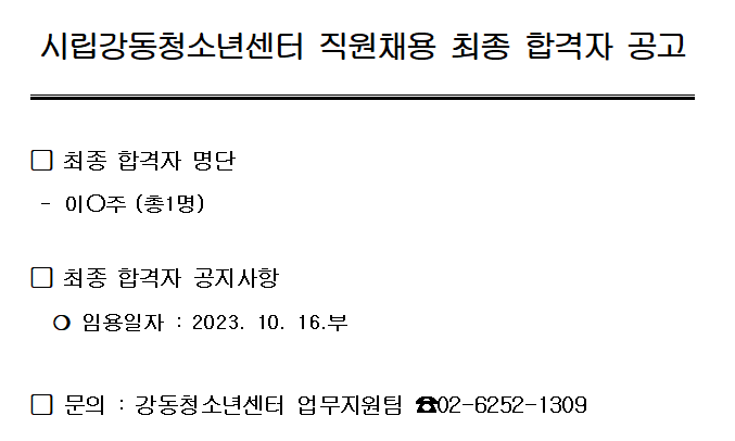| ½Ã¸³°µ¿Ã»¼Ò³â¼¾ÅÍ Á÷¿øÃ¤¿ë ÃÖÁ¾ ÇÕ°ÝÀÚ °ø°í | |||