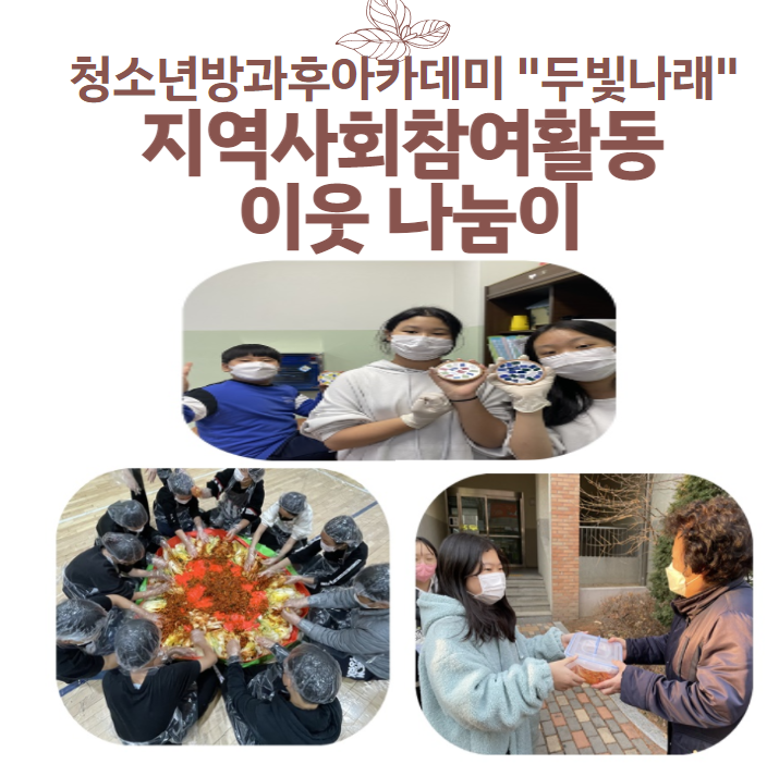 û¼Ò³âµé°ú ÀÌ¿ô³ª´®À» À§ÇÑ ¹°Ç° Á¦ÀÛ ¹× ±èÀåȰµ¿À» ÁøÇàÇÏ¿´´Âµ¥¿ä~! ÃÑ 3ȸÂ÷¿¡ °ÉÃÄ ÀÌ·ç¾îÁ³½À´Ï´Ù~~~!!!(¦¦¦) 1Â÷·Î ÀÌ¿ô ³ª´®À» À§ÇÑ ¹°Ç° Á¦ÀÛ! ÄŹÞħ(ƼÄÚ½ºÅÍ) ¸¸µé±â¸¦ ÁøÇàÇÏ¿´±¸¿ä~! 2Â÷·Î ƼÄÚ½ºÅÍ ³ª´® Ȱµ¿! 3Â÷·Î ±èÀå ´ã±×±â Ȱµ¿ ¹× ³ª´®È°µ¿À» ÁøÇàÇÏ¿´½À´Ï´Ù! À̹ø Ȱµ¿À» ÅëÇØ Áö¿ª»çȸ¿¡ ´ëÇÑ °ü½ÉÀ» °®µµ·Ï ÇÏ¿´À¸¸ç, û¼Ò³â¹æ°úÈľÆÄ«µ¥¹Ì¸¦ È«º¸ÇÒ ¼ö Àִ Ȱµ¿ÀÌ µÇ¾ú´ä´Ï´Ù~! °Àϵ¿ Áֹμ¾ÅÍ¿Í ¿¬°èÇÏ¿© ¼Ò¿Ü ÀÌ¿ô ¾î¸£½ÅÀ» ¹ß±¼ÇÏ¿©, Á÷Á¢ Àü´ÞÇÏ¿´À¸¸ç ÃÖ´ëÇÑ ºñ´ë¸éÀ¸·Î ÁøÇàµÉ ¼ö ÀÖµµ·Ï ÇÏ¿´½À´Ï´Ù. ¸ðµç µÎºû³ª·¡ Ä£±¸µé °í»ýÇß¾î¿ä~!!!! ¢¾