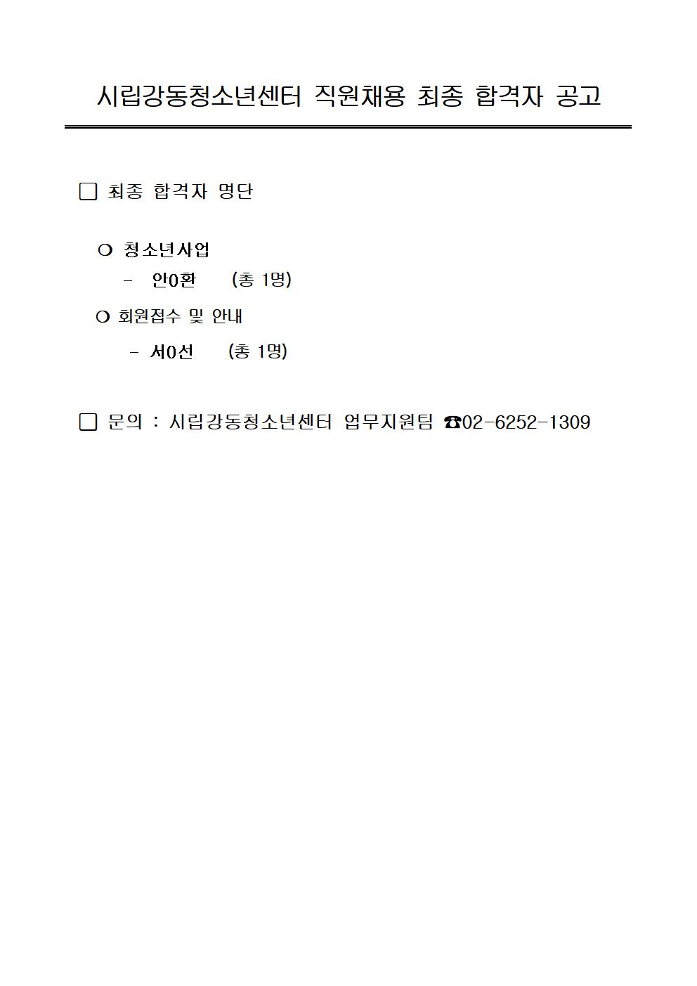 | ½Ã¸³°µ¿Ã»¼Ò³â¼¾ÅÍ Á÷¿ø ä¿ë ÃÖÁ¾ ÇÕ°ÝÀÚ °ø°í | |||