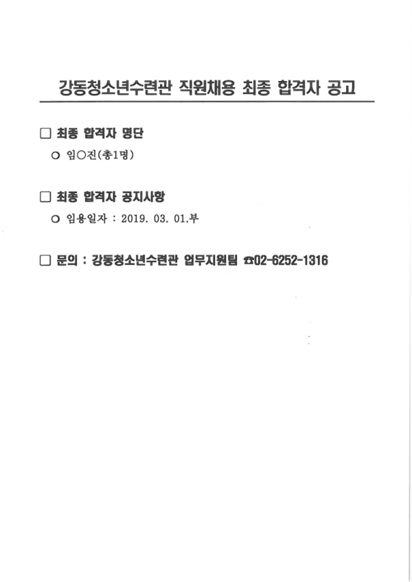 | °µ¿Ã»¼Ò³â¼ö·Ã°ü Á÷¿øÃ¤¿ë(°è¾àÁ÷) ÃÖÁ¾ÇÕ°ÝÀÚ ¹ßÇ¥ | |||