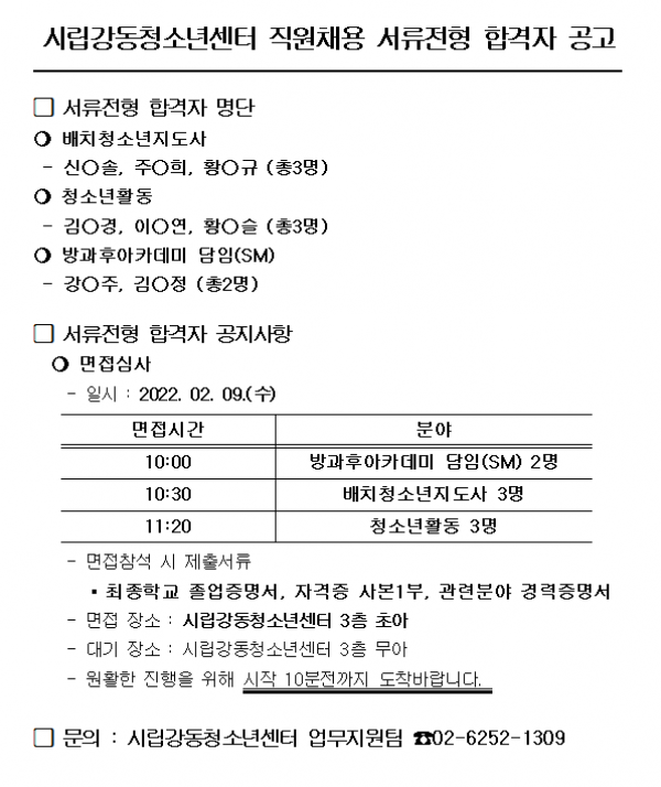 | ½Ã¸³°µ¿Ã»¼Ò³â¼¾ÅÍ Á÷¿øÃ¤¿ë(¹èġû¼Ò³âÁöµµ»ç ¿Ü 2°³ºÐ¾ß) ¼·ùÀüÇü ÇÕ°ÝÀÚ °ø°í | |||