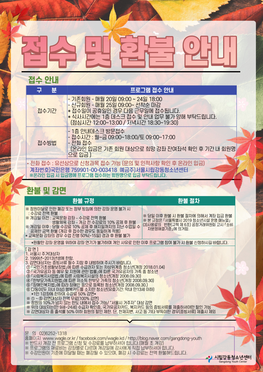 °µ¿Ã»¼Ò³â¼¾ÅÍ Æò»ý±³À°ÇÁ·Î±×·¥Àº ±âÁ¸ ȸ¿ø ¸Å¿ù 20~24ÀÏ(18½Ã)¿¡ Á¢¼ö ÇÏ½Ç ¼ö ÀÖÀ¸¸ç ½Å±Ô Á¢¼ö´Â ¸Å¿ù 25ÀÏ(ÀÏ¿äÀÏ ¶Ç´Â °øÈÞÀÏÀÏ ½Ã ´ÙÀ½³¯) ÇöÀå ¼±Âø¼ø Á¢¼ö·Î ÁøÇàµË´Ï´Ù. ´Ü 9¿ùÀº 25ÀÏÀÌ ÀÏ¿äÀÏÀÎ °ü°è·Î 9¿ù 26ÀÏ(¿ù)¿¡ ½Å±ÔÁ¢¼ö¸¦ ½ÃÀÛÇÕ´Ï´Ù. ½Å±Ô Á¢¼ö ½Ã ÁÖÀÇ»çÇ×!! ¸Å¿ù 24ÀÏ Àú³á 8½Ã ÀÌÈÄ¿¡ ¼¾ÅÍ È¨ÆäÀÌÁö¿¡ ¸¶°¨ ÇÁ·Î±×·¥ ¾È³»·Î °³½ÃÇϰí ÀÖÀ¸´Ï ÀÜ¿© Á¼®À» È®ÀÎÇÏ½Ã°í ¼¾ÅÍ¿¡ ³»¹æÇÏ¿© Áֽñ⠹ٶø´Ï´Ù.