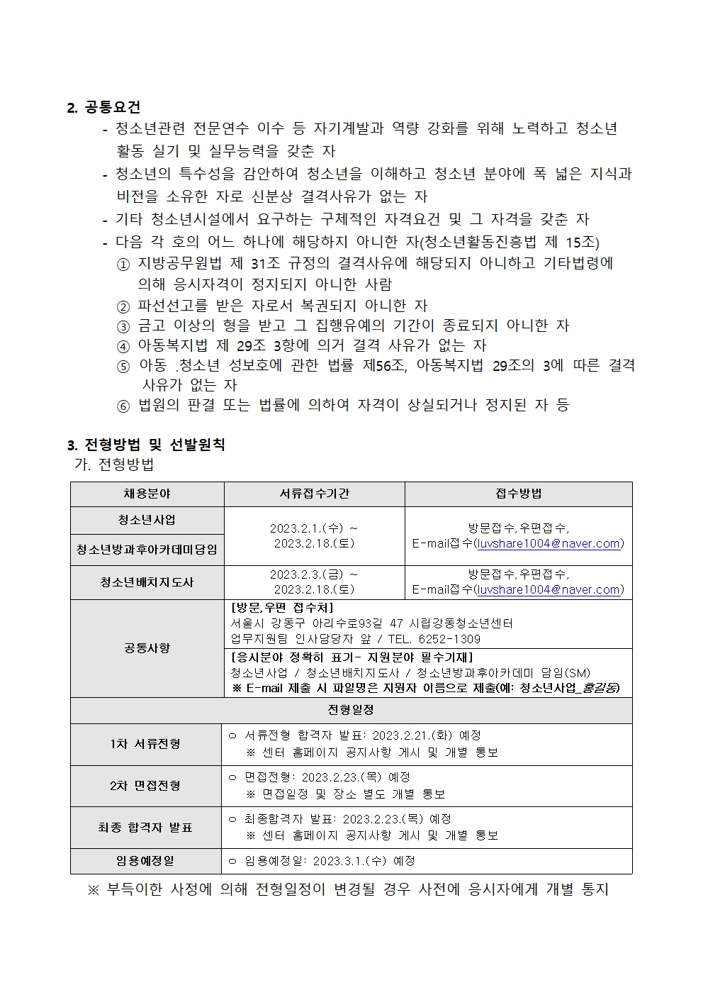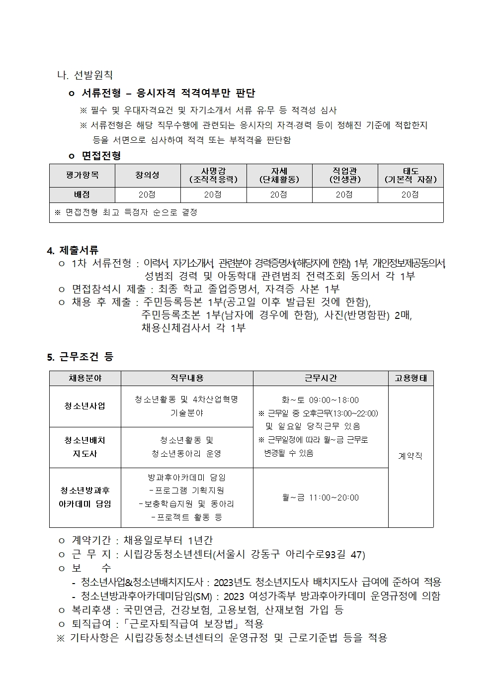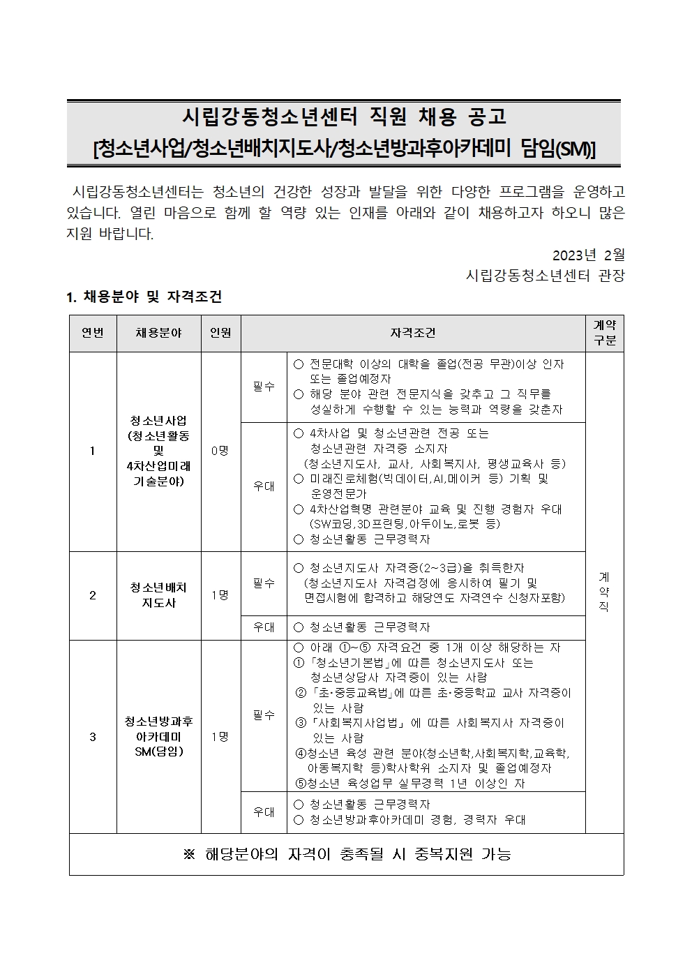 | ½Ã¸³°µ¿Ã»¼Ò³â¼¾ÅÍ Á÷¿ø ä¿ë(û¼Ò³â»ç¾÷/û¼Ò³â¹èÄ¡Áöµµ»ç/û¼Ò³â¹æ°úÈľÆÄ«µ¥¹Ì´ãÀÓ) º¯°æ °ø°í(º¯°æÀü 23.2.1)_ä¿ëºÐ¾ß Ãß°¡ | |||