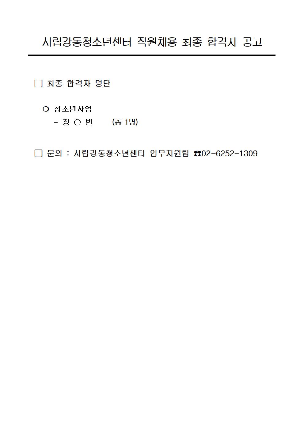 | ½Ã¸³°µ¿Ã»¼Ò³â¼¾ÅÍ Á÷¿ø ä¿ë ÃÖÁ¾ ÇÕ°ÝÀÚ °ø°í | |||