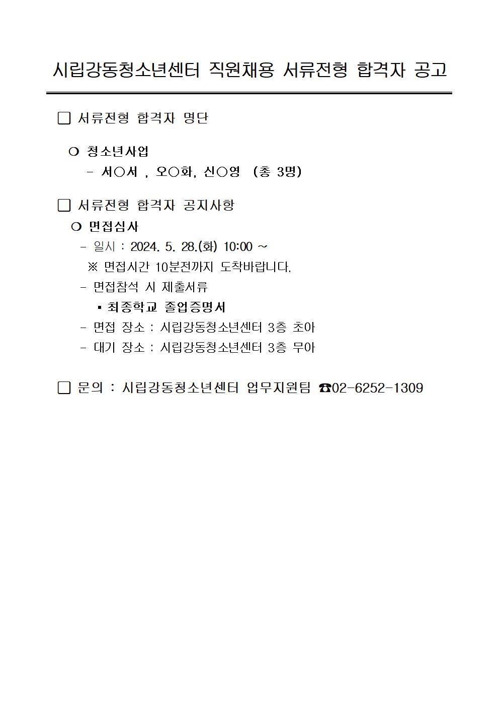 | ½Ã¸³°µ¿Ã»¼Ò³â¼¾ÅÍ Á÷¿øÃ¤¿ë ¼·ùÀüÇü ÇÕ°ÝÀÚ °ø°í | |||