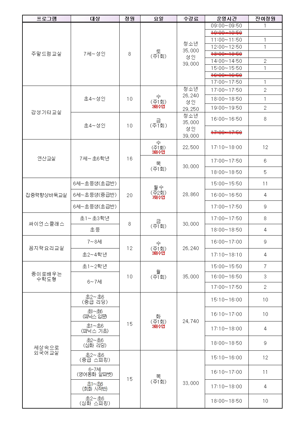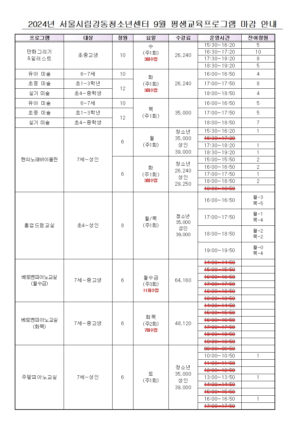 8¿ù 24ÀÏ 16½Ã ±âÁØÀ¸·Î ±âÁ¸È¸¿ø Á¢¼ö¸¦ ¸¶°¨ÇÏ¿´½À´Ï´Ù. ¡Ú2024³â 9¿ù Æò»ý±³À°ÇÁ·Î±×·¥ ½Å±Ôȸ¿ø °ÁÂÁ¢¼ö´Â 8¿ù26ÀÏ(¿ù) ¿ÀÀü9½Ã(ÀÎÅͳÝ,¹æ¹®Á¢¼ö µ¿ÀÏ)ºÎÅÍ ½ÃÀÛÇÕ´Ï´Ù.¡Ú ÇÁ·Î±×·¥ ȸ¿ø ½Å±Ô Á¢¼ö´Â ¼±Âø¼øÀ¸·Î ÁøÇàµÇ¸ç ¹æ¹® Á¢¼ö½Ã ¼ø¹ø¿¡ µû¶ó Á¢¼ö¸¦ ½ÃÀÛÇÕ´Ï´Ù. °Á º° ÀÜ¿© ÀοøÀ» È®ÀÎÇϽðí, 8/26(¿ù) ÀÎÅͳÝÀ¸·Î Á¢¼ö ¶Ç´Â ¼¾ÅÍ¿¡ Á÷Á¢ ¹æ¹® ÇÏ¿© Áֽñ⠹ٶø´Ï´Ù. ½Å±Ôȸ¿ø Á¢¼öÀÏ¿¡´Â ÇöÀå Á¢¼ö¿Í ÀÎÅÍ³Ý Á¢¼ö°¡ µ¿½Ã¿¡ ÁøÇàµË´Ï´Ù. ¡Ú¼ö°ÀÚ¸í(¾ÆÀÌÀ̸§)À¸·Î ÀÎÅÍ³Ý È¸¿ø °¡ÀÔÀ» ¸ÕÀú ÁøÇàÇØ Áֽñ⠹ٶø´Ï´Ù.(¿¬¶ôó´Â ºÎ¸ð´Ô ¹øÈ£·Î ±âÀç)¡Ú ¼¾ÅͰ¡ óÀ½À̽нűÔȸ¿øÀº ¼ø¼ ±â´Ù¸®½Ã´Â µ¿¾È ½Å±Ôȸ¿ø ½Åû¼¿Í ÀÎÅÍ³Ý È¸¿ø °¡ÀÔÀ» µ¿½Ã¿¡ ÁøÇàÇØÁֽðí, ¹øÈ£Ç¥¿Í ÇÔ²² ¾È³»µ¥½ºÅ©¿¡ ÀÎÅͳÝÀ¸·Î °¡ÀÔÇÏ¿´´Ù°í ¸»¾¸ Àü´ÞÇØÁÖ½Ã±æ ¹Ù¶ø´Ï´Ù. ÁÖÀÇ»çÇ×!!!! -¹øÈ£Ç¥ ¼ö·É ÈÄ ´ë±âÇϸé¼, ÀÎÅÍ³Ý È¸¿ø°¡ÀÔ ÈÄ ÀÎÅÍ³Ý Á¢¼ÓÇϼż ¼ö°µî·ÏÀ» 9½ÃºÎÅÍ ÁøÇàÇϵµ·Ï ±Ç°íÇÕ´Ï´Ù. ¿ÀÀü9½Ã¿¡ ÇöÀå°ú ÀÎÅͳݿ¡¼ µ¿½Ã Á¢¼ÓÀÌ °¡´ÉÇϱ⠶§¹®¿¡, ÇöÀåµî·ÏÀÌ ¿ì¼±ÀÌ ¾Æ´Ñ °áÁ¦ ¼ø¼´ë·Î ÁøÇàÀÌ µË´Ï´Ù. (ÇöÀå¿¡¼ °Á µî·ÏÁß¿¡¶óµµ ÀÎÅͳݿ¡¼ ÁøÇàÇÏ´Â ºÐÀÌ ¸ÕÀú °áÁ¦°¡ ÁøÇàµÉ ¼ö ÀÖ½À´Ï´Ù.) ¡Úȸ¿ø(½Å±Ô ¹× ±âÁ¸). (ÇØ´çÀÚ-->¸¸9¼¼~24¼¼.û¼Ò³â) -´ÙµÕÀÌÄ«µå ¼ÒÁöÀÚ: ½Ç¹° ÇÃ¶ó½ºÆ½ Ä«µå ¶Ç´Â ´ÙµÕÀÌ ¾ÛÄ«µå(¼¿ïÁö°©), +½Å±Ôȸ¿øÀº ÃÖ±Ù ÇÑ´ÞÀ̳» ¹ß±ÞÇÑ Áֹεî·Ïµîº» ÁöÂü -¼ö±ÞÀÚ: ¼ö±ÞÀÚ¼·ù.(½Å±Ôȸ¿øÀº ÃÖ±Ù ÇÑ´ÞÀ̳» ¹ß±ÞÇÑ Áֹεî·Ïµîº» ÁöÂü) ²À ÁöÂüÇÏ½Ã°í ¹æ¹®ÇÏ¿© ÁֽʽÿÀ. [°¨¸é´ë»ó ½Å±Ô ȸ¿ø ÁÖÀÇ»çÇ×] 1. ÀÎÅÍ³Ý ½Å±ÔÁ¢¼ö½Ã ÇÒÀÎÀü ±Ý¾× °áÁ¦ 2. 26ÀÏ ¼¾Å͹湮-> ÇÒÀÎ ±Ý¾×À¸·Î Àç°áÁ¦ 3. ÀÎÅÍ³Ý Á¢¼öºÐ Ãë¼Ò 4. Áغñ¹° : ´ÙµÕÀÌ ½Ç¹° Ä«µå(ÀÚ³à »ý³â¿ùÀÏ Ç¥±âµÈ Ä«µå, ½Å¿ëÄ«µåX) ¶Ç´Â ¾ÛÄ«µå(¼¿ïÁö°©) + Áֹεî·Ïµîº»(ÃÖ±Ù1°³¿ù À̳» ¹ß±Þ) ¼ö±ÞÀÚ ÇØ´ç¼·ù + Áֹεî·Ïµîº»(ÃÖ±Ù1°³¿ù À̳» ¹ß±Þ)