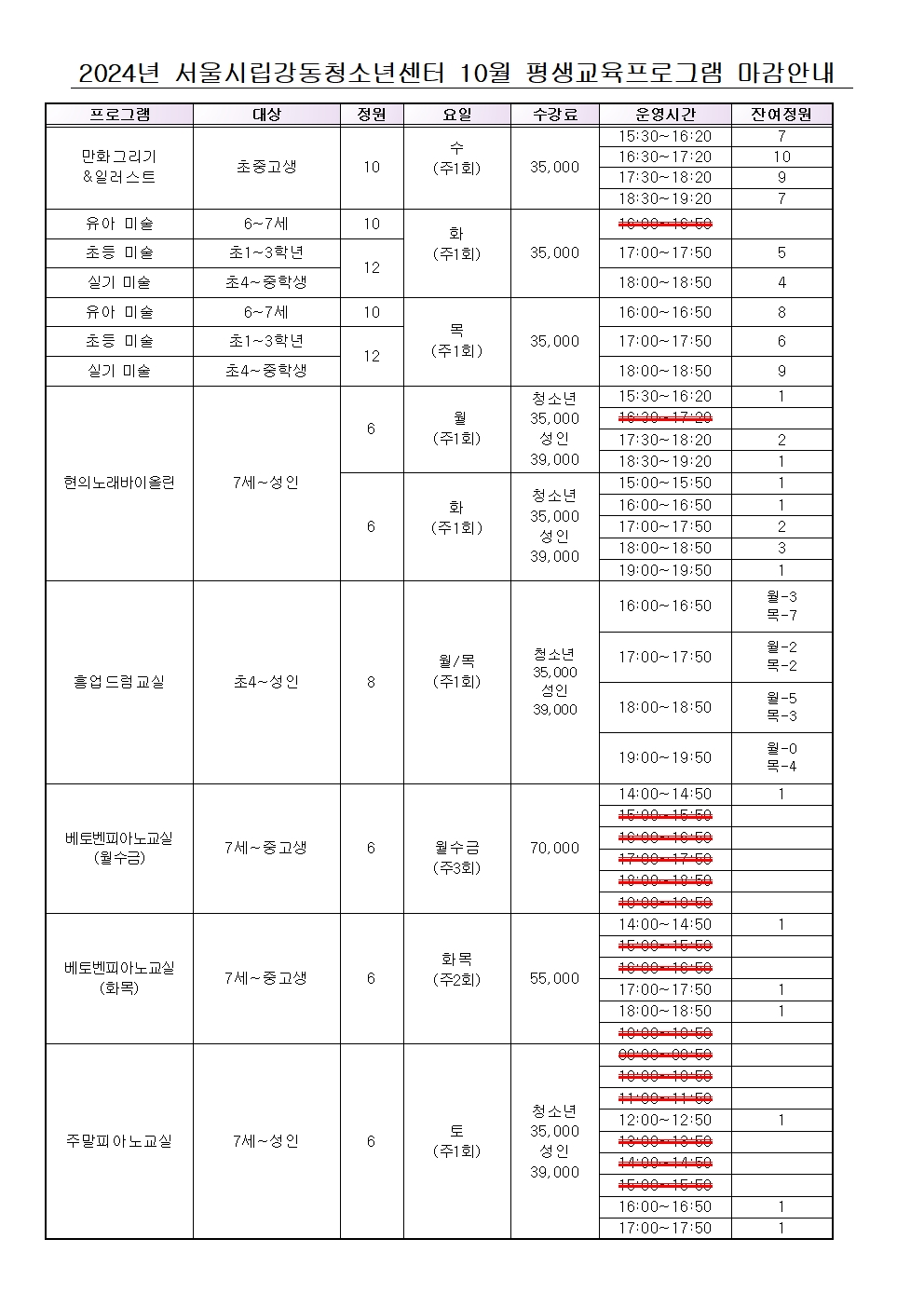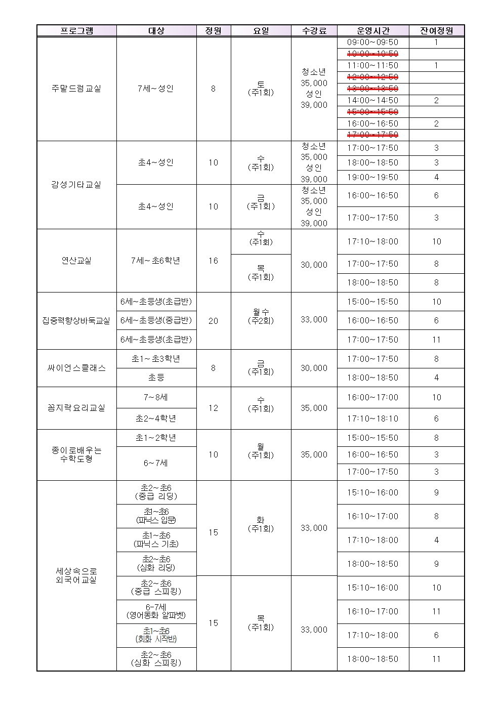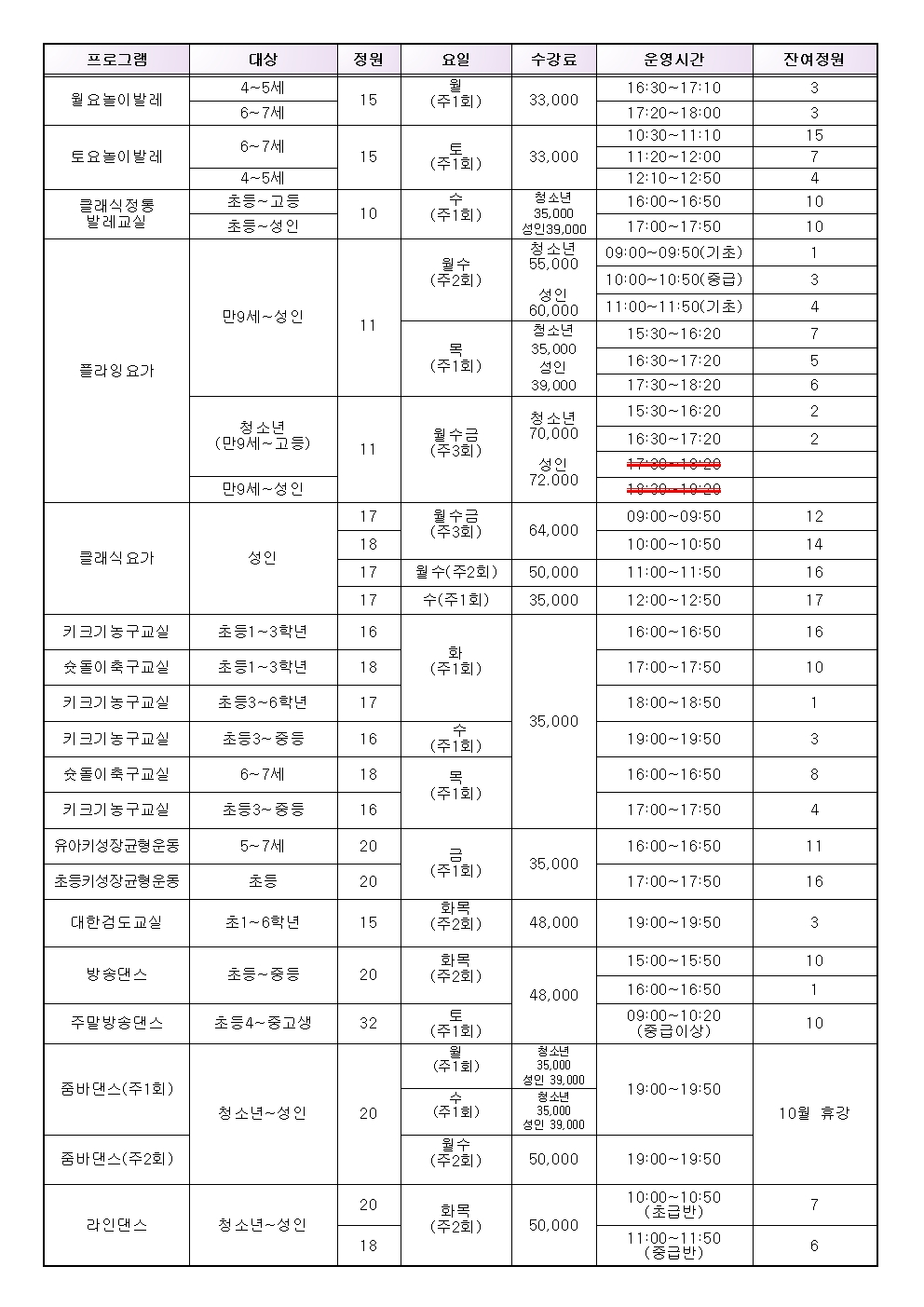 9¿ù 24ÀÏ 18½Ã ±âÁØÀ¸·Î ±âÁ¸È¸¿ø Á¢¼ö¸¦ ¸¶°¨ÇÏ¿´½À´Ï´Ù. ¡Ú2024³â 10¿ù Æò»ý±³À°ÇÁ·Î±×·¥ ½Å±Ôȸ¿ø °ÁÂÁ¢¼ö´Â 9¿ù25ÀÏ(¼ö) ¿ÀÀü9½Ã(ÀÎÅͳÝ,¹æ¹®Á¢¼ö µ¿ÀÏ)ºÎÅÍ ½ÃÀÛÇÕ´Ï´Ù.¡Ú ÇÁ·Î±×·¥ ȸ¿ø ½Å±Ô Á¢¼ö´Â ¼±Âø¼øÀ¸·Î ÁøÇàµÇ¸ç ¹æ¹® Á¢¼ö½Ã ¼ø¹ø¿¡ µû¶ó Á¢¼ö¸¦ ½ÃÀÛÇÕ´Ï´Ù. °Á º° ÀÜ¿© ÀοøÀ» È®ÀÎÇϽðí, 9/25(¼ö) ÀÎÅͳÝÀ¸·Î Á¢¼ö ¶Ç´Â ¼¾ÅÍ¿¡ Á÷Á¢ ¹æ¹® ÇÏ¿© Áֽñ⠹ٶø´Ï´Ù. ½Å±Ôȸ¿ø Á¢¼öÀÏ¿¡´Â ÇöÀå Á¢¼ö¿Í ÀÎÅÍ³Ý Á¢¼ö°¡ µ¿½Ã¿¡ ÁøÇàµË´Ï´Ù. ¡Ú¼ö°ÀÚ¸í(¾ÆÀÌÀ̸§)À¸·Î ÀÎÅÍ³Ý È¸¿ø °¡ÀÔÀ» ¸ÕÀú ÁøÇàÇØ Áֽñ⠹ٶø´Ï´Ù.(¿¬¶ôó´Â ºÎ¸ð´Ô ¹øÈ£·Î ±âÀç)¡Ú ¼¾ÅͰ¡ óÀ½À̽нűÔȸ¿øÀº ¼ø¼ ±â´Ù¸®½Ã´Â µ¿¾È ½Å±Ôȸ¿ø ½Åû¼¿Í ÀÎÅÍ³Ý È¸¿ø °¡ÀÔÀ» µ¿½Ã¿¡ ÁøÇàÇØÁֽðí, ¹øÈ£Ç¥¿Í ÇÔ²² ¾È³»µ¥½ºÅ©¿¡ ÀÎÅͳÝÀ¸·Î °¡ÀÔÇÏ¿´´Ù°í ¸»¾¸ Àü´ÞÇØÁÖ½Ã±æ ¹Ù¶ø´Ï´Ù. ÁÖÀÇ»çÇ×!!!! -¹øÈ£Ç¥ ¼ö·É ÈÄ ´ë±âÇϸé¼, ÀÎÅÍ³Ý È¸¿ø°¡ÀÔ ÈÄ ÀÎÅÍ³Ý Á¢¼ÓÇϼż ¼ö°µî·ÏÀ» 9½ÃºÎÅÍ ÁøÇàÇϵµ·Ï ±Ç°íÇÕ´Ï´Ù. ¿ÀÀü9½Ã¿¡ ÇöÀå°ú ÀÎÅͳݿ¡¼ µ¿½Ã Á¢¼ÓÀÌ °¡´ÉÇϱ⠶§¹®¿¡, ÇöÀåµî·ÏÀÌ ¿ì¼±ÀÌ ¾Æ´Ñ °áÁ¦ ¼ø¼´ë·Î ÁøÇàÀÌ µË´Ï´Ù. (ÇöÀå¿¡¼ °Á µî·ÏÁß¿¡¶óµµ ÀÎÅͳݿ¡¼ ÁøÇàÇÏ´Â ºÐÀÌ ¸ÕÀú °áÁ¦°¡ ÁøÇàµÉ ¼ö ÀÖ½À´Ï´Ù.) ¡Úȸ¿ø(½Å±Ô ¹× ±âÁ¸). (ÇØ´çÀÚ-->¸¸9¼¼~24¼¼.û¼Ò³â) -´ÙµÕÀÌÄ«µå ¼ÒÁöÀÚ: ½Ç¹° ÇÃ¶ó½ºÆ½ Ä«µå ¶Ç´Â ´ÙµÕÀÌ ¾ÛÄ«µå(¼¿ïÁö°©)+ ½Å±Ôȸ¿øÀº ÃÖ±Ù ÇÑ´ÞÀ̳» ¹ß±ÞÇÑ Áֹεî·Ïµîº» ÁöÂü -¼ö±ÞÀÚ: ¼ö±ÞÀÚ¼·ù + ½Å±Ôȸ¿øÀº ÃÖ±Ù ÇÑ´ÞÀ̳» ¹ß±ÞÇÑ Áֹεî·Ïµîº» ÁöÂü ²À ÁöÂüÇÏ½Ã°í ¹æ¹®ÇÏ¿© ÁֽʽÿÀ. [°¨¸é´ë»ó ½Å±Ô ȸ¿ø ÁÖÀÇ»çÇ×] 1. ÀÎÅÍ³Ý ½Å±ÔÁ¢¼ö½Ã ÇÒÀÎÀü ±Ý¾× °áÁ¦ 2. 25ÀÏ ¼¾Å͹湮-> ÇÒÀÎ ±Ý¾×À¸·Î Àç°áÁ¦ 3. ÀÎÅÍ³Ý Á¢¼öºÐ Ãë¼Ò 4. Áغñ¹° : ´ÙµÕÀÌ ½Ç¹° Ä«µå(ÀÚ³à »ý³â¿ùÀÏ Ç¥±âµÈ Ä«µå, ½Å¿ëÄ«µåX) ¶Ç´Â ¾ÛÄ«µå(¼¿ïÁö°©) + Áֹεî·Ïµîº»(ÃÖ±Ù1°³¿ù À̳» ¹ß±Þ) ¼ö±ÞÀÚ ÇØ´ç¼·ù + Áֹεî·Ïµîº»(ÃÖ±Ù1°³¿ù À̳» ¹ß±Þ)