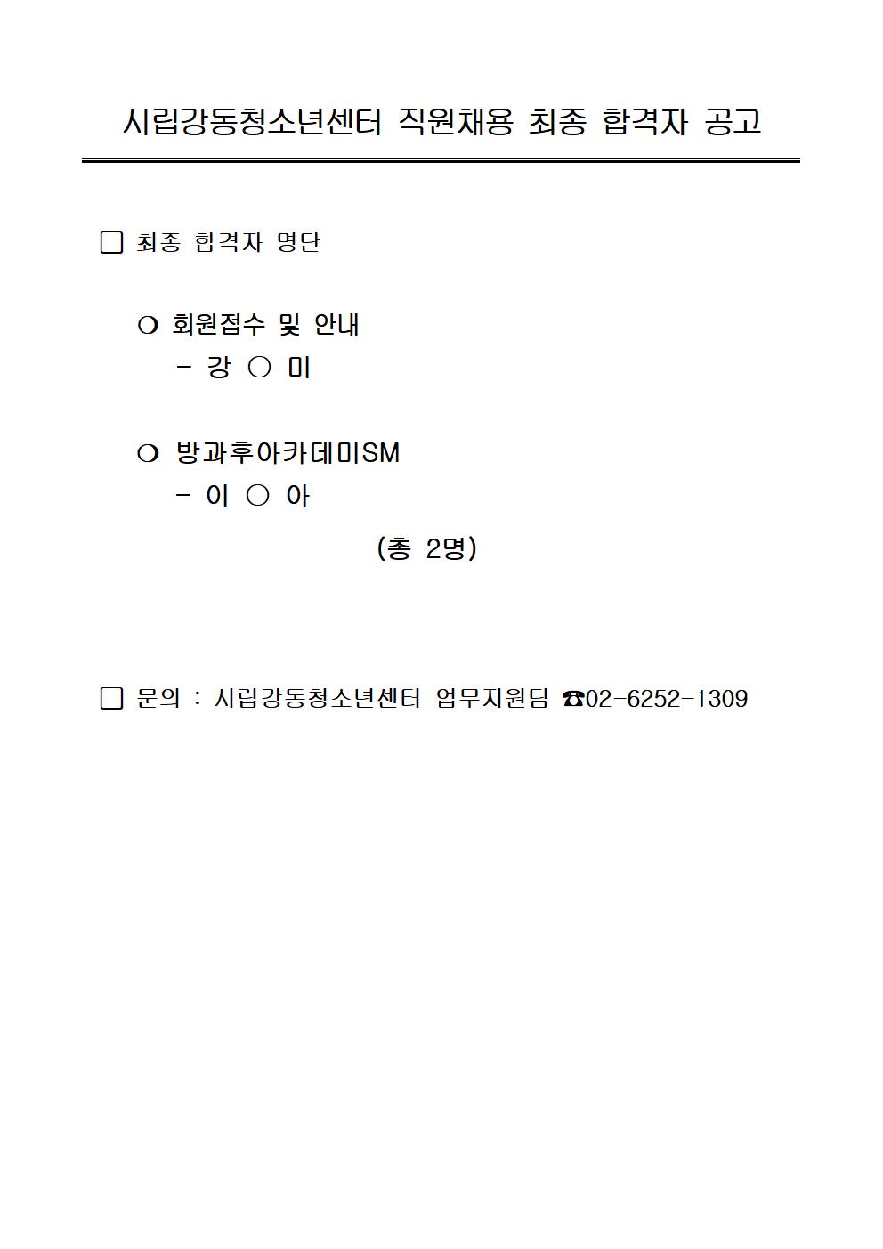 | ½Ã¸³°µ¿Ã»¼Ò³â¼¾ÅÍ Á÷¿ø ä¿ë ÃÖÁ¾ ÇÕ°ÝÀÚ °ø°í | |||