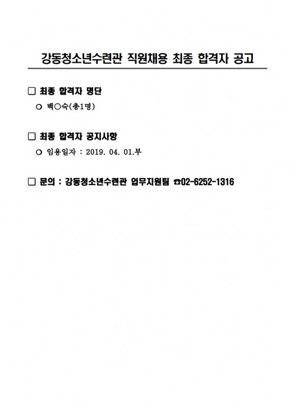 | °µ¿Ã»¼Ò³â¼ö·Ã°ü Á÷¿øÃ¤¿ë(ÄÚµð³×ÀÌÅÍ) ÃÖÁ¾ÇÕ°ÝÀÚ ¹ßÇ¥ | |||