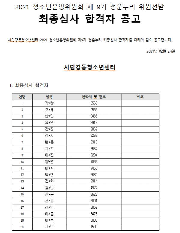 | 2021³â Á¦9±â û¼Ò³â¿î¿µÀ§¿øÈ¸ û¿î´©¸® ÃÖÁ¾½É»ç ÇÕ°ÝÀÚ °ø°í | |||