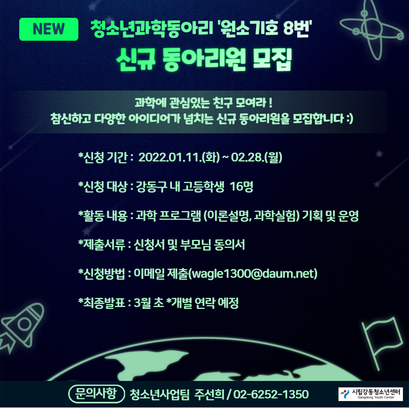 | 2022 û¼Ò³â°úÇе¿¾Æ¸® '¿ø¼Ò±âÈ£ 8¹ø' ½Å±Ô µ¿¾Æ¸®¿ø ¸ðÁý | |||