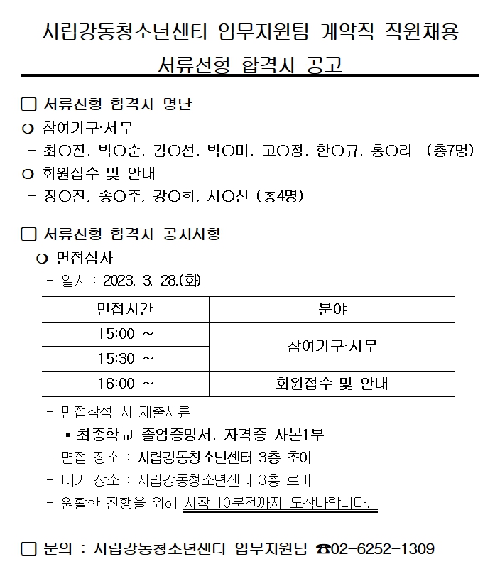 | ½Ã¸³°µ¿Ã»¼Ò³â¼¾ÅÍ ¾÷¹«Áö¿øÆÀ °è¾àÁ÷ Á÷¿øÃ¤¿ë ¼·ùÀüÇü °á°ú | |||