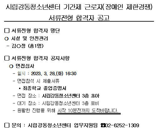 | ½Ã¸³°µ¿Ã»¼Ò³â¼¾ÅÍ ±â°£Á¦ ±Ù·ÎÀÚ(Àå¾ÖÀÎ Á¦ÇѰæÀï)¼·ùÀüÇü ÇÕ°ÝÀÚ °ø°í | |||