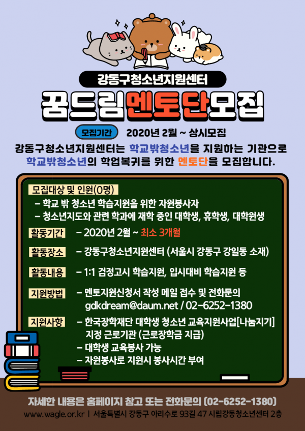 1. Ȱµ¿ °³¿ä ¡Û »ç ¾÷ ¸í : ²Þµå¸² ¸àÅä´Ü ¡Ø ´ëÇлý û¼Ò³â ±³À°Áö¿ø»ç¾÷ ±Ù·Î±â°ü ¡Û ¸ðÁý±â°ü : °µ¿±¸ û¼Ò³âÁö¿ø¼¾ÅÍ ²Þµå¸² ¡Û Ȱµ¿±â°£ : 2020³â 3¿ù ~ 12¿ù (´Ü±â, Àå±â Á¶Á¤ °¡´É) ¡Û Ȱµ¿³»¿ë : Çб³ ¹Û û¼Ò³â ´ë»ó ÇнÀÁö¿ø ¸àÅä Ȱµ¿ ¡Û Ȱµ¿Àå¼Ò : °µ¿±¸ û¼Ò³âÁö¿ø¼¾ÅÍ ²Þµå¸² ¡Ø ²Þµå¸² ¸àÅä¶õ? Çб³ ¹Û û¼Ò³âÀÇ Çо÷º¹±Í¿Í »çȸÁøÀÔ µîÀ» µ½±â À§ÇØ ¼³Ä¡µÈ û¼Ò³âÁö¿ø¼¾ÅÍ ²Þµå¸²¿¡¼ û¼Ò³âµé¿¡°Ô ÇнÀÁö¿ø(°ËÁ¤°í½Ã°øºÎÁöµµ), Á¤¼Áö¿ø(°í¹Î»ó´ã) Ȱµ¿À» ÇÏ´Â Àç´É±âºÎÀÚµéÀ» ÀǹÌÇÕ´Ï´Ù. 2. ¸àÅä´Ü ¸ðÁý°³¿ä ¡Û ¸ðÁý´ë»ó : ´ëÇлý ¹× ÈÞÇлý ¡Û ¸ðÁýÀοø : 0¸í ¡Û ¸ðÁý±â°£ : ¿¬Áß »ó½Ã ¡Û ½Åû¹æ¹ý : ¸àÅäÁö¿ø½Åû¼ ÀÛ¼º ¸ÞÀÏÁ¢¼ö ¹× Àüȹ®ÀÇ(gdkdream@daum.net) ¡Û ¹® ÀÇ : ¸àÅä ´ã´çÀÚ (02-6252-1380, 1391,1329) 3. ¼±¹ß ¹× Ȱµ¿ÀýÂ÷ ¼·ù Á¢¼ö | ¢Ñ | ¿À¸®¿£Å×ÀÌ¼Ç | ¢Ñ | ¸àÅäȰµ¿ | ¼·ù Á¢¼ö ¹× ¼±¹ß | ¸àÅäȰµ¿¾È³» ¹× ±³À° | ¸àƼ ¸ÅĪ ÈÄ È°µ¿ ½ÃÀÛ |