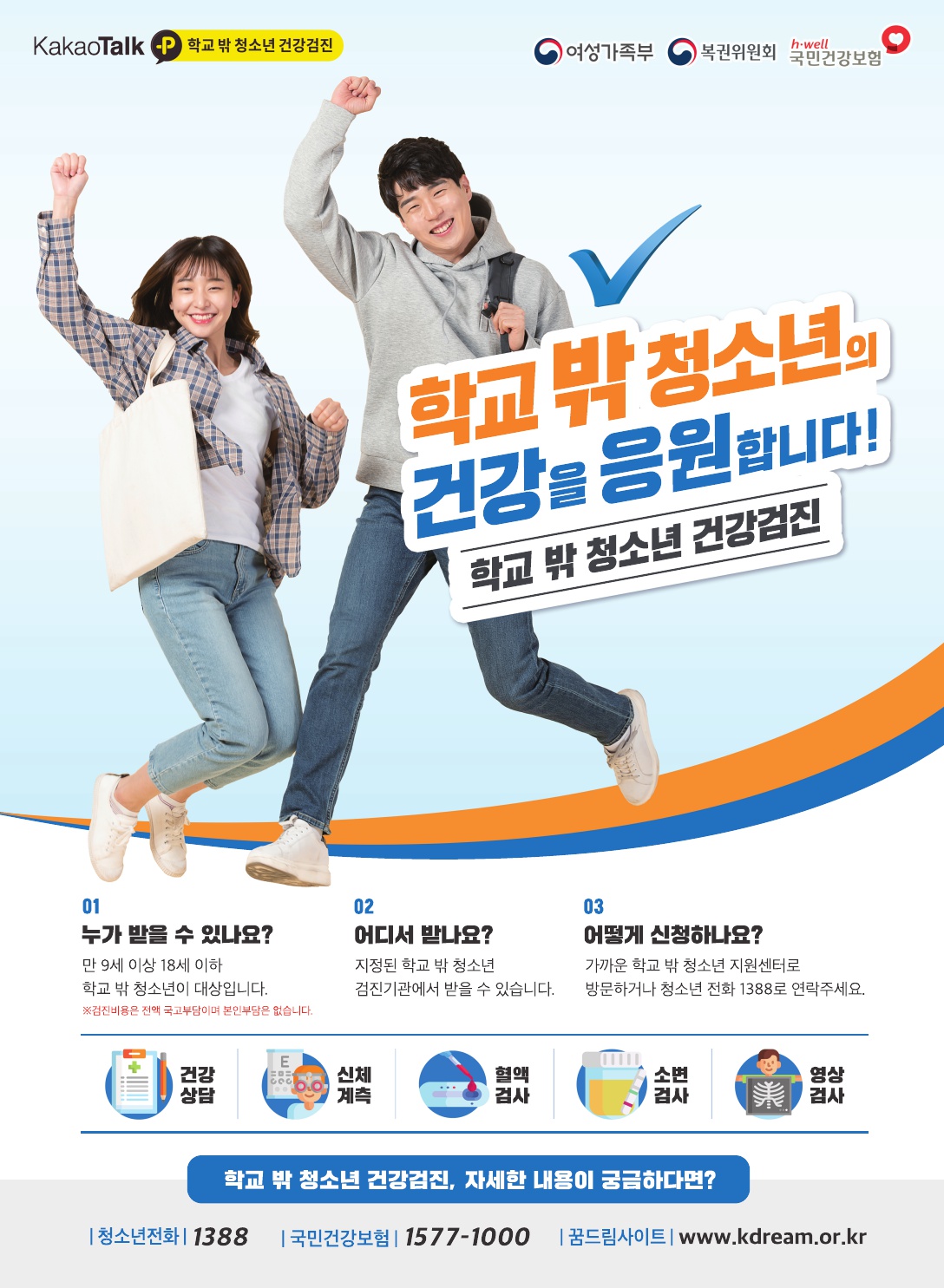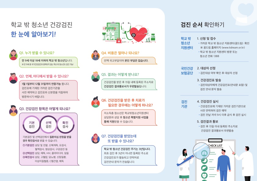 ¡Ý °³¿ä - Çб³ ¹Û û¼Ò³âÀÌ °Ç°ÇÏ°Ô ¼ºÀåÇÒ ¼ö ÀÖµµ·Ï Áö¿øÇϱâ À§ÇØ Çб³ ¹Û û¼Ò³âÀ» ´ë»óÀ¸·Î Á¤±â °Ç°°ËÁø ½ÃÇà ¡Ý Áö¿ø´ë»ó - 9¼¼ ÀÌ»ó 18¼¼ ÀÌÇÏ Çб³ ¹Û û¼Ò³â(2003³â»ý~2012³â»ý) ¡Ø ´Ù¸¸ 19¼¼ Çб³ ¹Û û¼Ò³âÀº °Ç°°ËÁøÀÌ °¡´ÉÇϳª ´Ù¸¥ ±¹°¡°Ç°°ËÁø°ú Áߺ¹ Áö¿ø ºÒ°¡ ¡Ý Áö¿ø³»¿ë - °ËÁøÇ׸ñ : Ç÷¾×°Ë»ç, °£¿°°Ë»ç, ±¸°°Ë»ç, °áÇÙ°ËÁø ¹× Àẹ°áÇÙ°ËÁø µî * È®Áø°Ë»ç Áö¿ø - ½Åû±â°£ : ¿¬Áß - °ËÁø±â°£ : ¿¬Áß - °ËÁøºñ¿ë : ¹«·á(°³ÀÎºÎ´ã¾øÀ½) - °ËÁø±â°ü : °Ç°IN ´©¸®Áý¿¡¼ È®ÀÎ - ¿î¿µ±â°ü : ±¹¹Î°Ç°º¸Çè°ø´Ü ¡Ý ½ÅûÀýÂ÷ ¹× ¹æ¹ý - Çб³ ¹Û û¼Ò³â Áö¿ø¼¾Å͸¦ ¹æ¹®Çϰųª ¿ìÆí ¶Ç´Â À̸ÞÀÏÀ¸·Î ½Åû(À̸ÞÀÏ Á¦Ã⠽ÿ¡´Â ¹Ýµå½Ã ÇØ´ç Çб³ ¹Û û¼Ò³â Áö¿ø¼¾ÅÍ¿Í ÇùÀÇ ÈÄ Á¦Ãâ)-> 02-6252-1388 ¹®Àǹٶ÷ ¡Ý Çʿ伷ù - °Ç°°ËÁø ½Åû¼(°³ÀÎÁ¤º¸¼öÁýÀ̿뵿ÀǼ Æ÷ÇÔ)