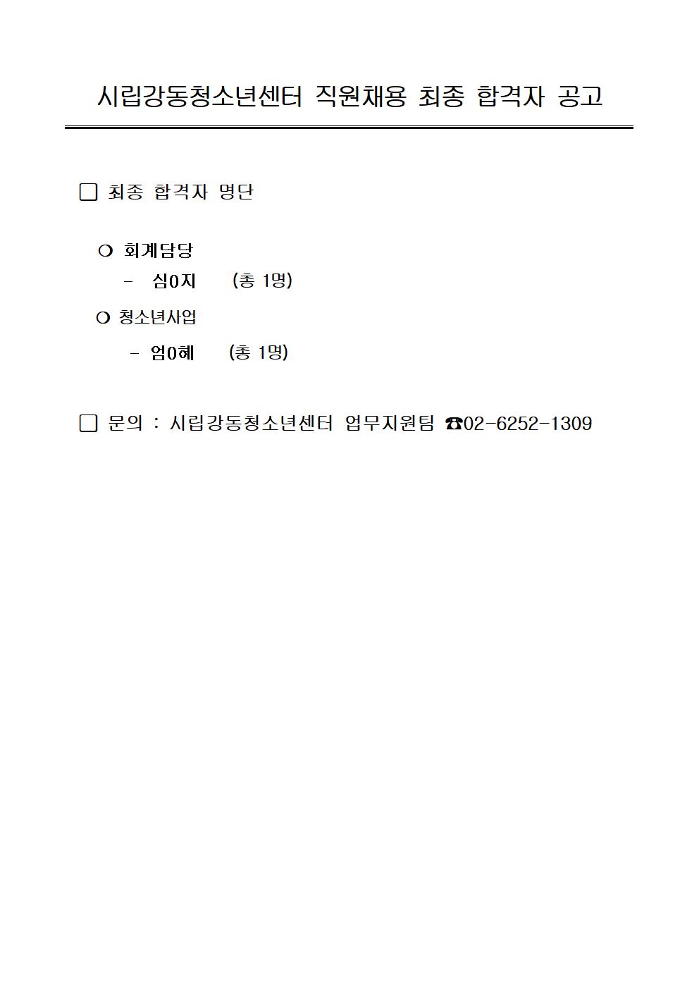 | ½Ã¸³°µ¿Ã»¼Ò³â¼¾ÅÍ Á÷¿ø ä¿ë ÃÖÁ¾ ÇÕ°ÝÀÚ °ø°í | |||