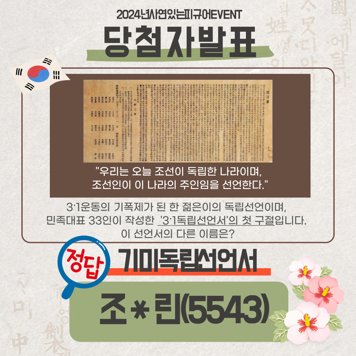 | 2024³â 3¿ù '»ç¿¬ÀÖ´Â ÇDZԾî' ÄûÁî À̺¥Æ® <´ç÷ÀÚ ¹ßÇ¥> | |||