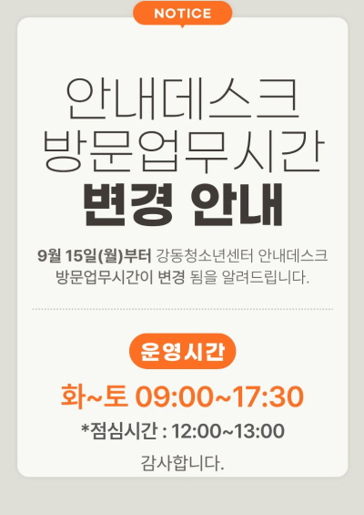 | ½Ã¸³°µ¿Ã»¼Ò³â¼¾ÅÍ ¾È³»µ¥½ºÅ© ¿î¿µ½Ã°£ º¯°æ¾È³» | |||