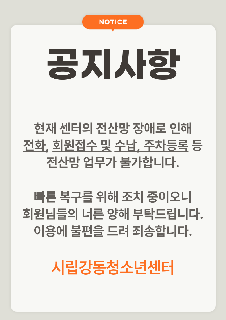 | °µ¿Ã»¼Ò³â¼¾ÅÍ Àü»ê¸Á Àå¾Ö·Î ÀÎÇÑ ¾÷¹«Áö¿¬ ¾È³» | |||
