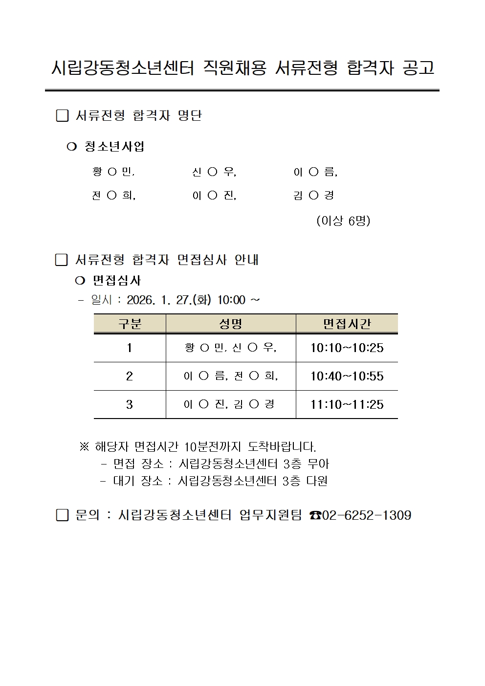 | ½Ã¸³°µ¿Ã»¼Ò³â¼¾ÅÍ Á÷¿øÃ¤¿ë(û¼Ò³â»ç¾÷) ¼·ùÀüÇü ÇÕ°ÝÀÚ ¹ßÇ¥ | |||