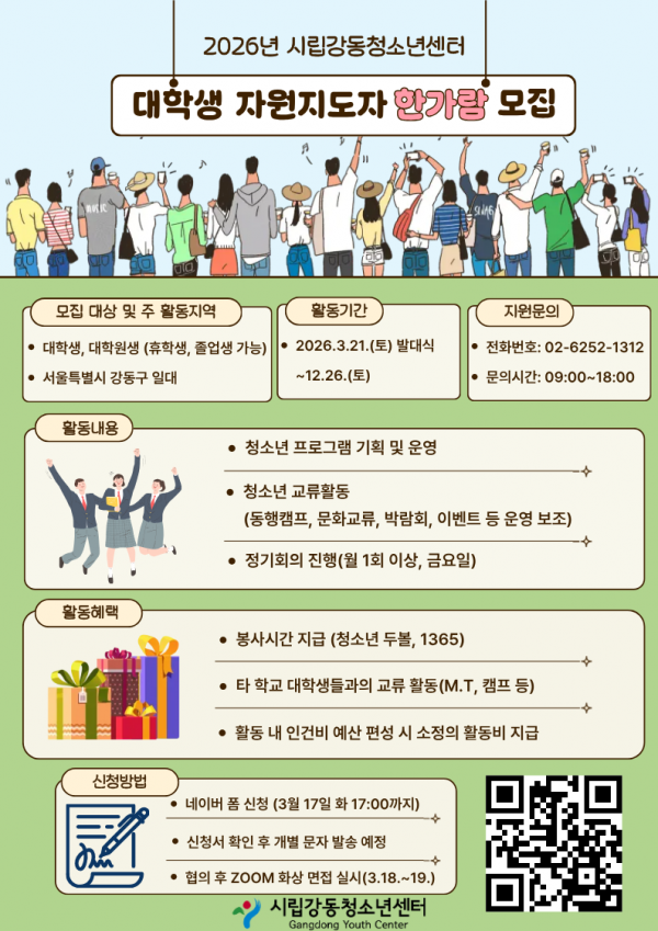 📅 ¸ðÁý °³¿ä ¸ðÁý ´ë»ó: ´ëÇлý, ´ëÇпø»ý (ÈÞÇлý ¹× Á¹¾÷»ý °¡´É) Ȱµ¿ Áö¿ª: ¼¿ïƯº°½Ã °µ¿±¸ ÀÏ´ë Ȱµ¿ ±â°£: 2026. 03. 21.(Åä) ¹ß´ë½Ä Âü¼® ~ 12. 26.(Åä)