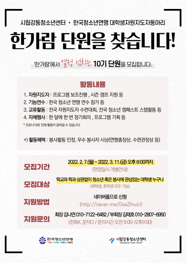 2022³âµµ ½Ã¸³°µ¿Ã»¼Ò³â¼¾ÅÍ ¼Ò¼Ó ´ëÇлýÀÚ¿øÁöµµÀÚ µ¿¾Æ¸® ¡®ÇѰ¡¶÷¡¯ 10±â ¸ðÁý ¡®ÇѰ¡¶÷¡¯¿¡¼ ¿Á¤ ³ÑÄ¡´Â 10±â ´Ü¿øÀ» ¸ðÁýÇÕ´Ï´Ù. ¡®ÇѰ¡¶÷¡¯Àº Çѱ¹Ã»¼Ò³â¿¬¸Í ÇÑ¿ïȸ ¼Ò¼Ó ½Ã¸³°µ¿Ã»¼Ò³â¼¾ÅÍ ´ëÇлýÀÚ¿øÁöµµÀÚ ÇѰ¡¶÷ µ¿¾Æ¸®ÀÔ´Ï´Ù. û¼Ò³â°ú ÇÔ²² ´Ù¾çÇÑ È°µ¿°ú ºÀ»ç¿¡ °ü½É ÀÖ´Â ´ëÇлý ¿©·¯ºÐÀÇ ¸¹Àº Áö¿ø ¹Ù¶ø´Ï´Ù.
