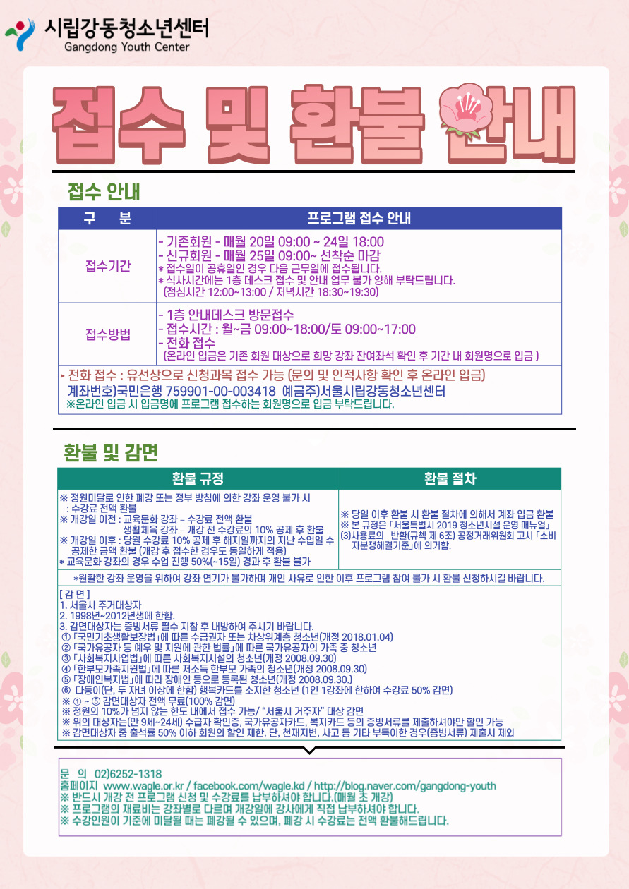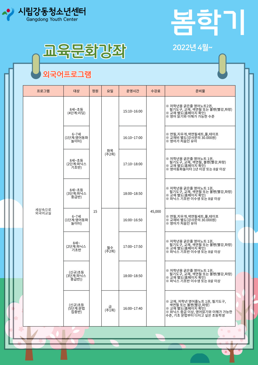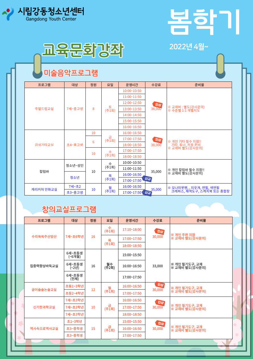 | 2022³â 4¿ù Æò»ý±³À°ÇÁ·Î±×·¥ ÇÁ·Î±×·¥ ¾È³»(±³À°¹®È»ç¾÷, »ýȰüÀ°»ç¾÷) - Âü°¡ºñ Àλó | |||