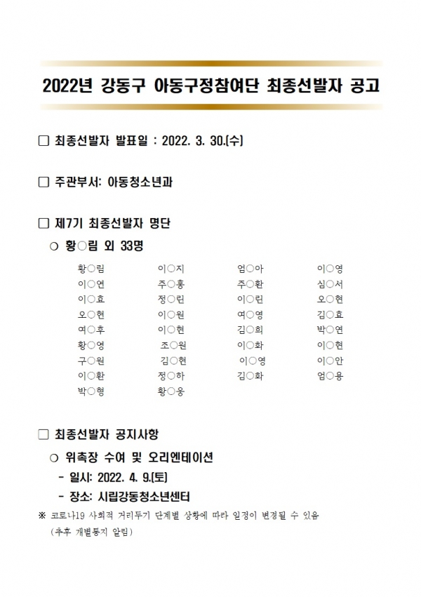 | 2022³â °µ¿±¸ ¾Æµ¿±¸Á¤Âü¿©´Ü ÃÖÁ¾¼±¹ßÀÚ °ø°í | |||