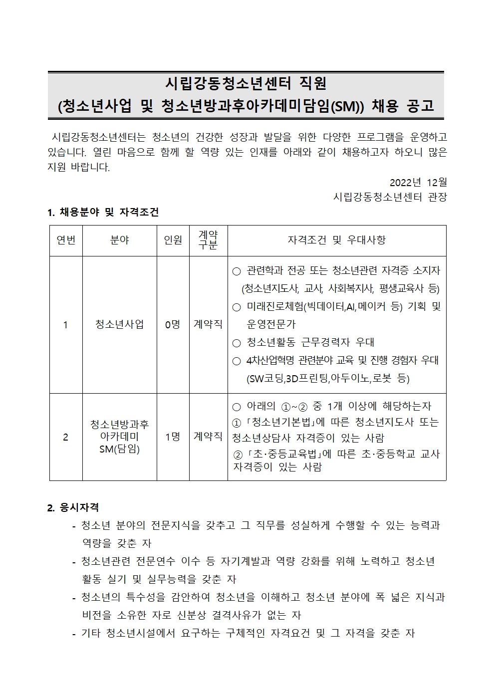 | °µ¿Ã»¼Ò³â¼¾ÅÍ(û¼Ò³â»ç¾÷ ¹× û¼Ò³â¹æ°úÈľÆÄ«µ¥¹Ì´ãÀÓ) Á÷¿ø ä¿ë °ø°í | |||