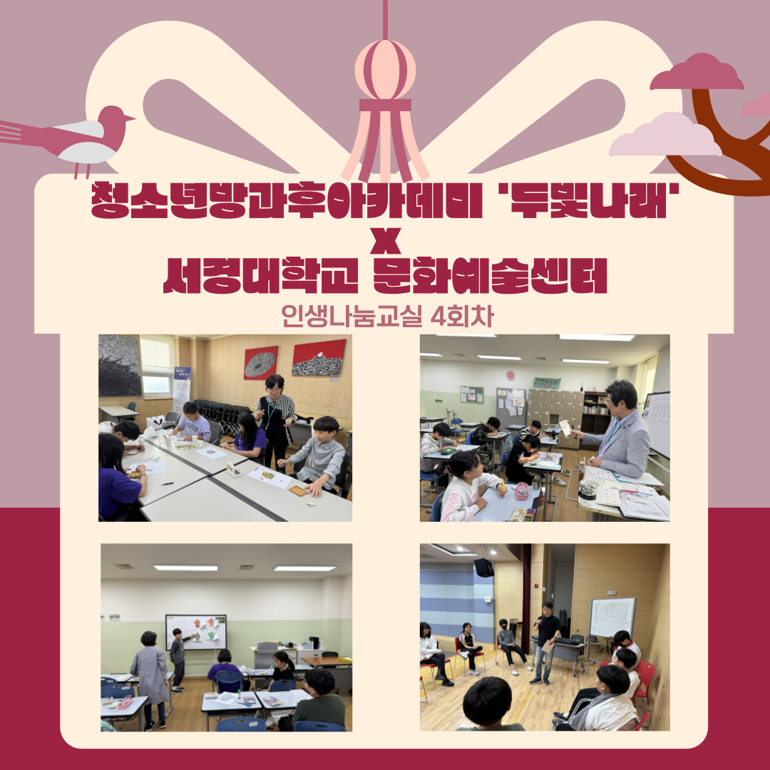 | ½Ã¸³°µ¿Ã»¼Ò³â¼¾ÅÍ 2024³â û¼Ò³â¹æ°úÈľÆÄ«µ¥¹Ì µÎºû³ª·¡ ¼°æ´ëÇб³ ¹®È¿¹¼ú¼¾ÅÍ ¿¬°è Àλý³ª´®±³½Ç 4ȸÂ÷ | |||
