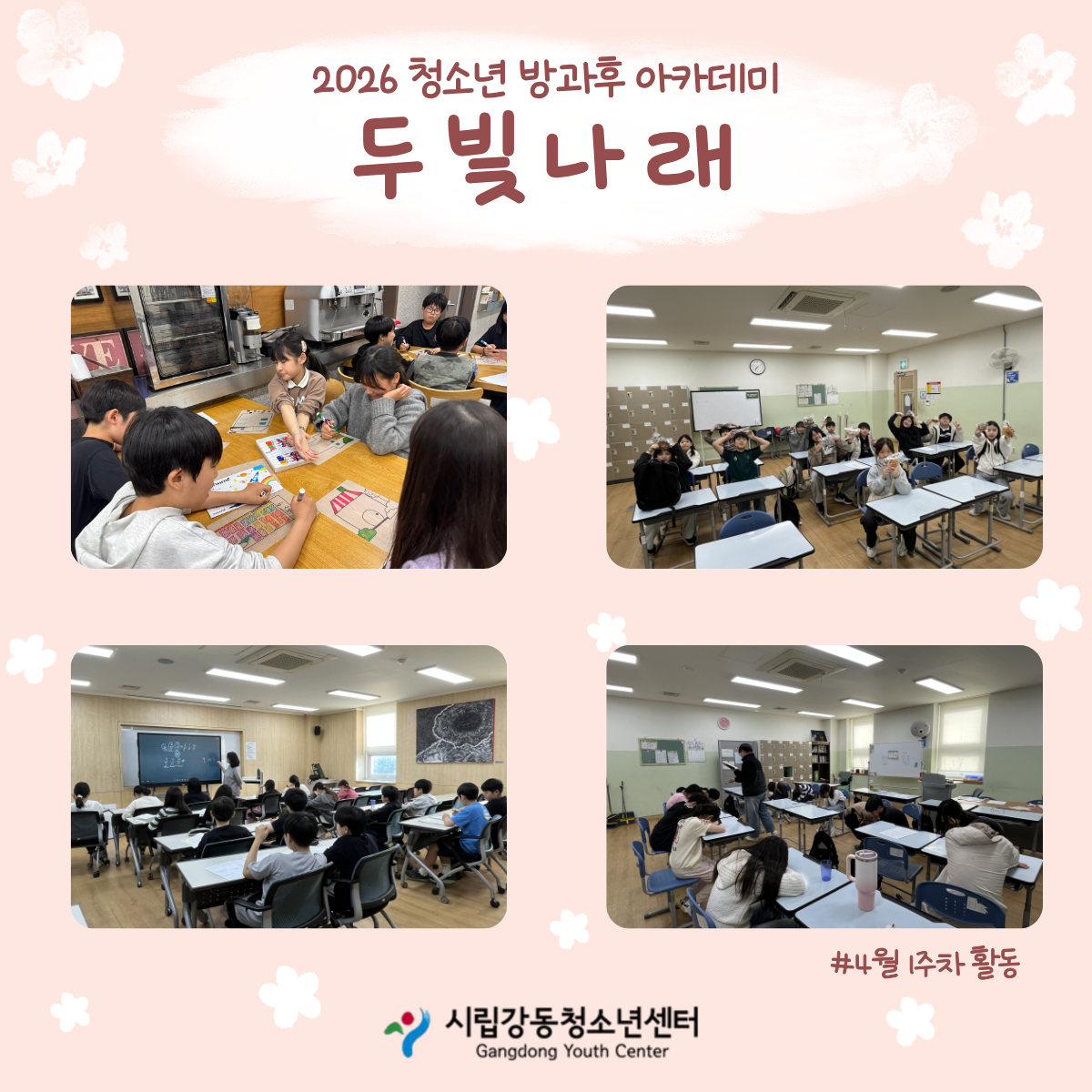2026³â µÎºû³ª·¡ 4¿ù ù° ÁÖ À̾߱⠵û¶æÇÑ º½°ú ÇÔ²² ½ÃÀÛµÈ 4¿ù, µÎºû³ª·¡ Ä£±¸µéÀº Áñ°Å¿î Ȱµ¿À¸·Î ÇÑ ÁÖ¸¦ º¸³Â½À´Ï´Ù. À̹ø ÁÖ¿¡´Â ¼öÇÐ ±³°úÇнÀ, ½ºÆ÷Ã÷ Ȱµ¿, ÇÕ⡤³Å¸ ¼ö¾÷À» ÅëÇØ ¹è¿ò°ú Ȱ·ÂÀ» µ¿½Ã¿¡ ä¿ì´Â ½Ã°£À» °¡Á³½À´Ï´Ù. ƯÈ÷ ¿µ¾îÈ¸È ¼ö¾÷Àº ÇÑ ÁÖ ½¬¾î°¡¸ç, üÀ° ¼ö¾÷À¸·Î ´ëü ÁøÇàµÇ¾î Ä£±¸µéÀÌ ´õ¿í ½Å³ª°Ô ¸öÀ» ¿òÁ÷ÀÏ ¼ö ÀÖ¾ú½À´Ï´Ù! ¶ÇÇÑ ÀÚüÇÁ·Î±×·¥ ½Ã°£¿¡´Â ·¹Å©¸®¿¡ÀÌ¼Ç È°µ¿°ú½´¸µÅ¬½º·Î Áý ¸¸µé±â¸¦ ÁøÇàÇß½À´Ï´Ù! Ä£±¸µéÀº ÇÔ²² ¿ô°í Áñ±â¸ç ÆÀ¿öÅ©¸¦ Ű¿ì°í, ½´¸µÅ¬½º Ȱµ¿¿¡¼´Â °¢ÀÚÀÇ °³¼ºÀ» ´ã¾Æ ¸ÚÁø ÀÛǰÀ» ¿Ï¼ºÇϸç âÀÇ·ÂÀ» ¹ßÈÖÇß½À´Ï´Ù.