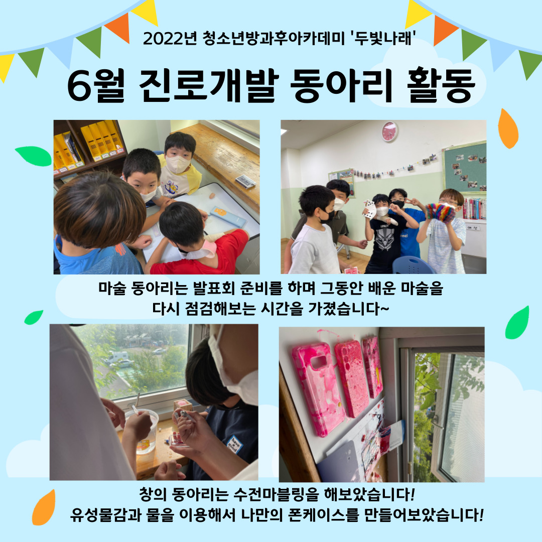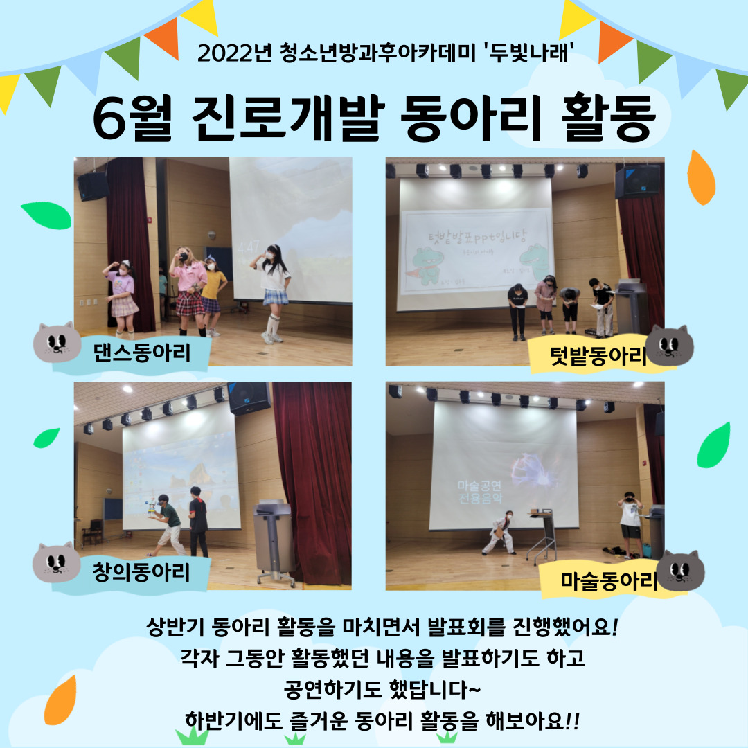 µÎºû³ª·¡ Ä£±¸µéÀÌ ÀÚ½ÅÀÇ °ü½ÉºÐ¾ß¿¡ ´ëÇØ Ž»öÇÒ ¼ö ÀÖµµ·Ï ÁøÇàµÇ´Â 'Áø·Î°³¹ß µ¿¾Æ¸® Ȱµ¿'!! »ó¹Ý±â ¸¶Áö¸· Ȱµ¿À» ÁøÇàÇß½À´Ï´Ù!