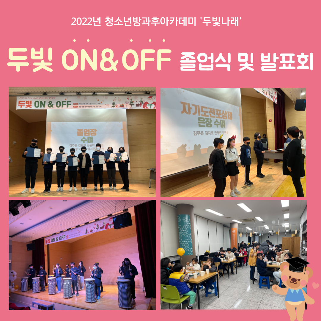 ¿ì¸® µÎºû³ª·¡ Ä£±¸µéÀÇ Á¹¾÷½Ä ¹× ¹ßǥȸ°¡ ÁøÇàµÇ¾ú½À´Ï´Ù. ¸¶·ç¹ÝÀÇ Á¹¾÷Àå ¼ö¿©¿Í ÇÔ²² ÇÑ ÇØ µ¿¾È 'µÎºû³ª·¡'¸¦ ºû³Â´ø û¼Ò³âµé¿¡°Ô »óÀå ¼ö¿©°¡ ÀÖ¾ú½À´Ï´Ù. »óÀº ¸ð¹ü»ó, ³ë·Â»ó, ºÐÀ§±â¸ÞÀÌÄ¿»óÀÌ ÀÖ¾ú´ä´Ï´Ù^^
